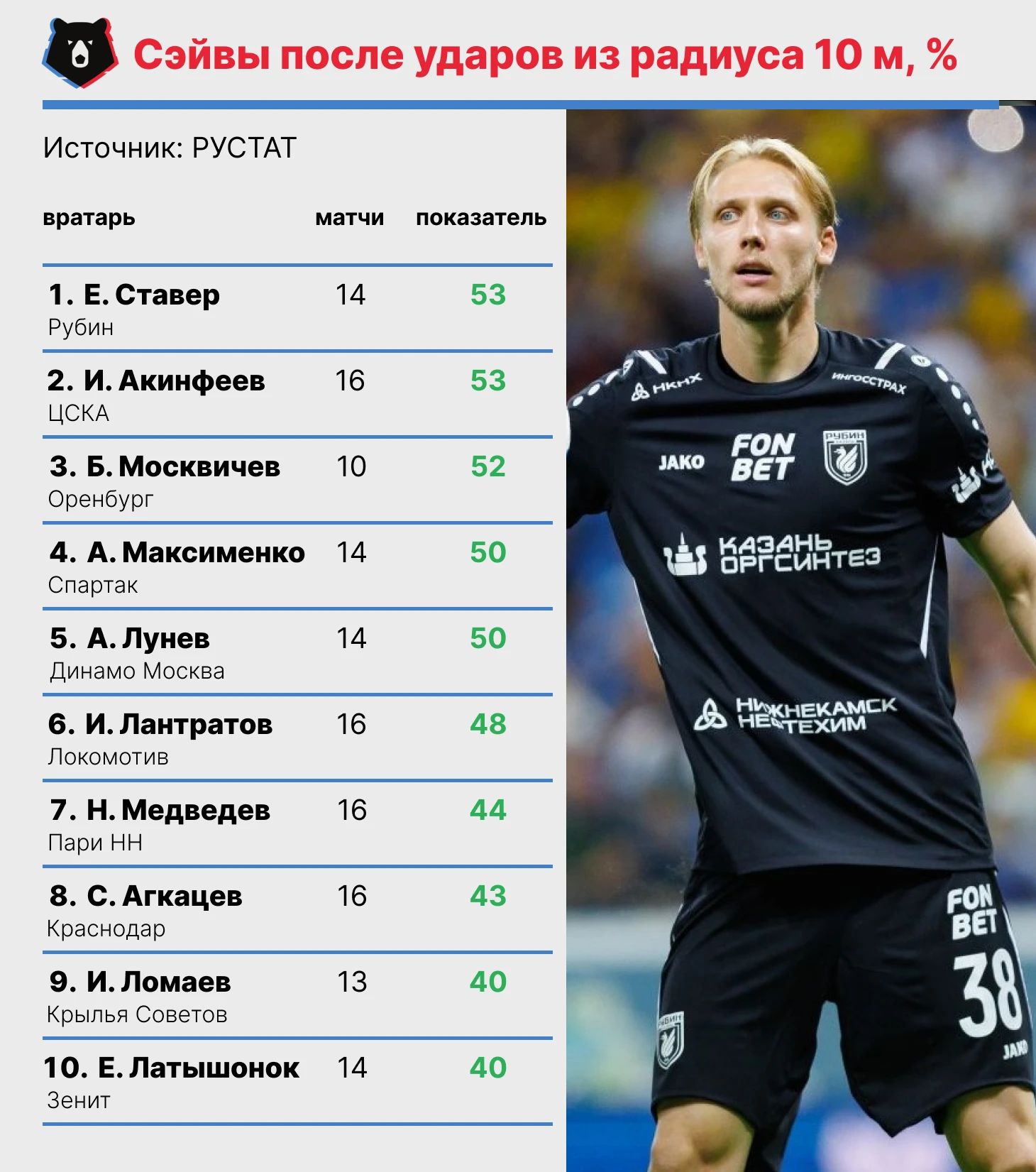 Лидер по данному показателю – Евгений Ставер из «Рубина». Бывший голкипер «Енисея» очень быстро и органично влился в стартовый состав казанцев, успел оформил 4 «сухаря» в РПЛ. Евгений опередил Игоря Акинфеева за счет бОльших абсолютных значений дополнительных показателей: количества нанесенных ближних удар в створ и большего количества отраженных ближних ударов. Радуюсь и горжусь экс-вратарем «Енисея».