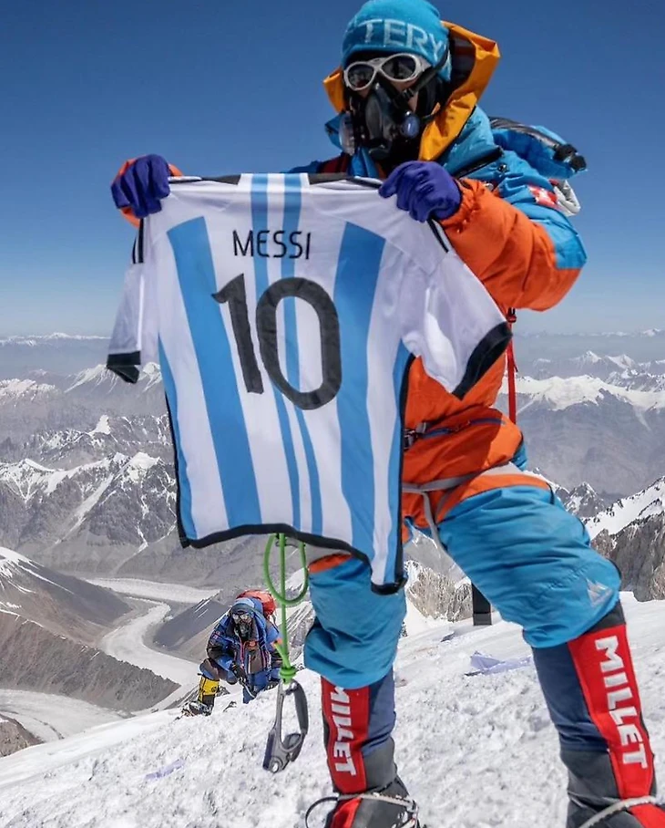 Китайский альпинист взял в горы футболку Месси и показал ее на высоте 8611 метров.