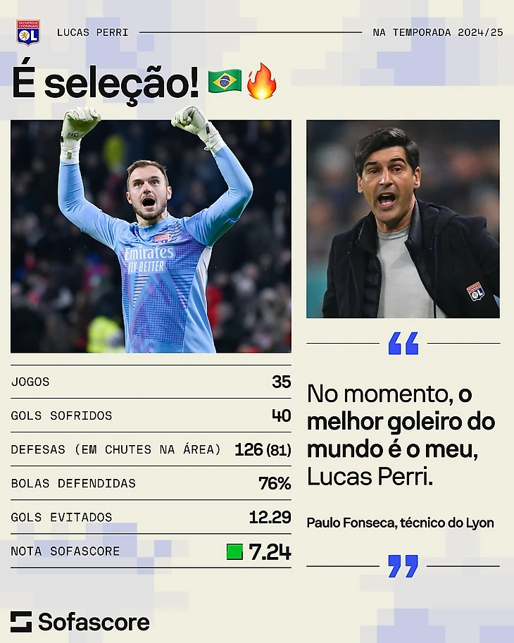 Наконец-то вызван Лукас Перри из «Лиона». Парень неброский, но очень надежный. Был более чем половиной команды в спуртовом для «Ботафого» сезоне-23, сейчас же кумир во Франции, а Паулу Фонсека и вовсе назвал его лучшим вратарем в мире на здесь и сейчас.