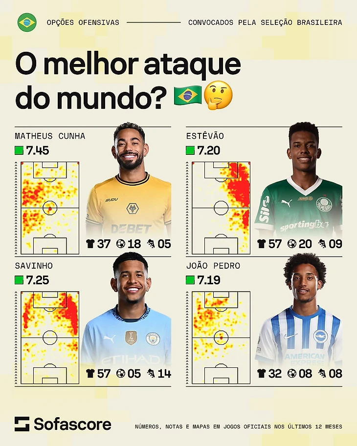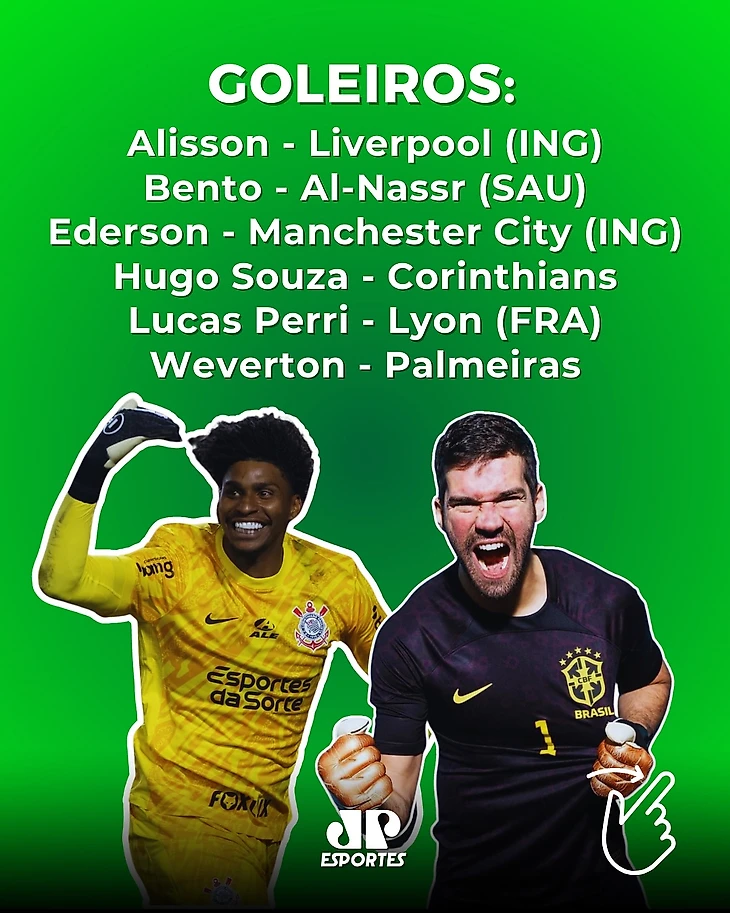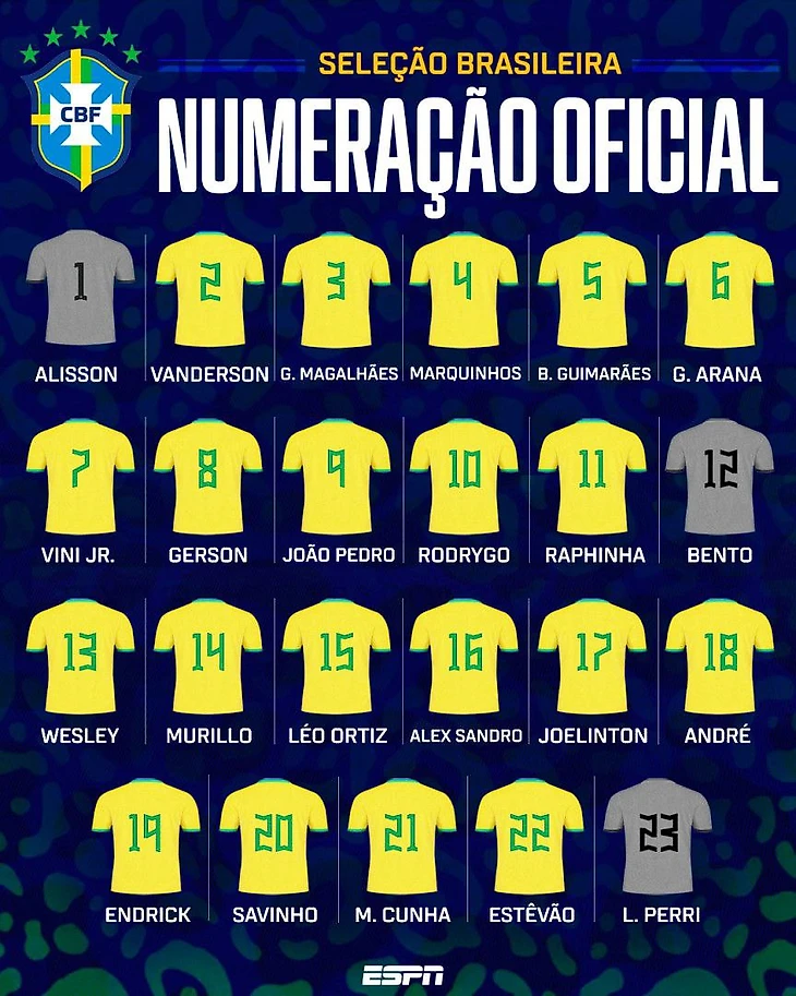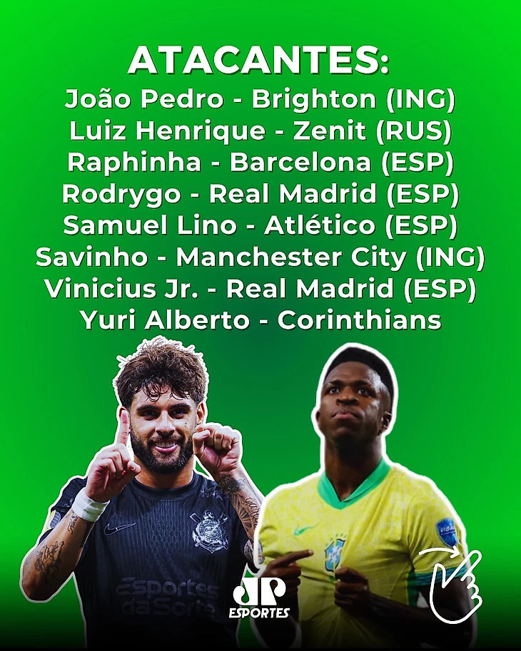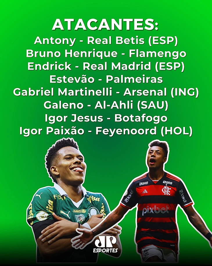 Нападающие -Рафинья (Барселона), Винисиус Жуниор и Эндрик (оба Реал), Савиньо (Манчестер Сити), Жоао Педро (Брайтон), Эстевао (Палмейрас)
