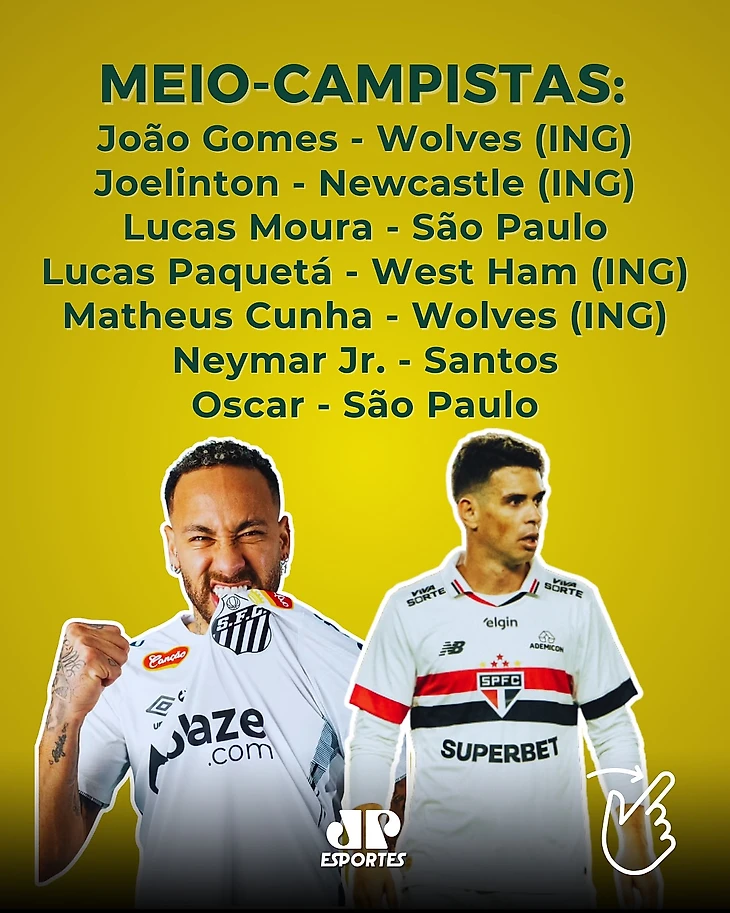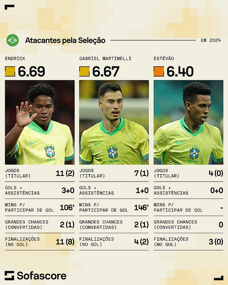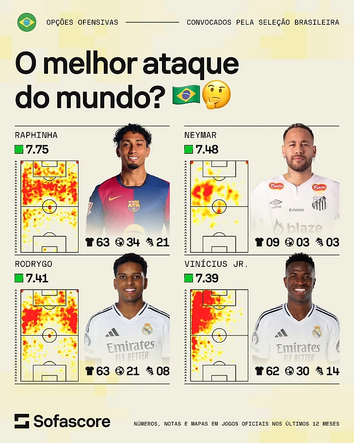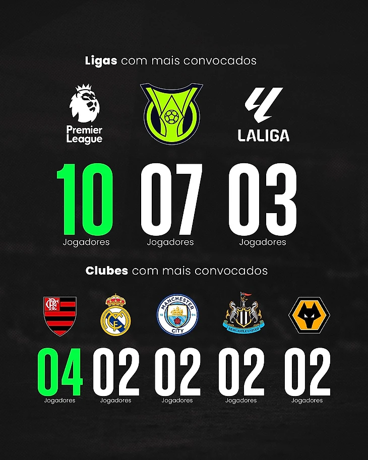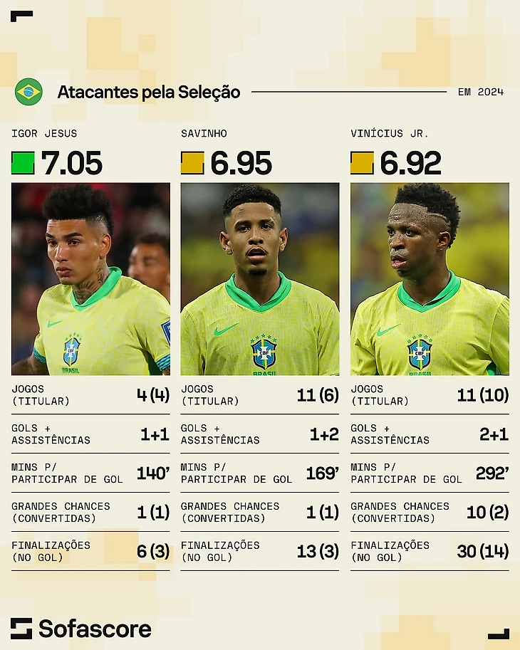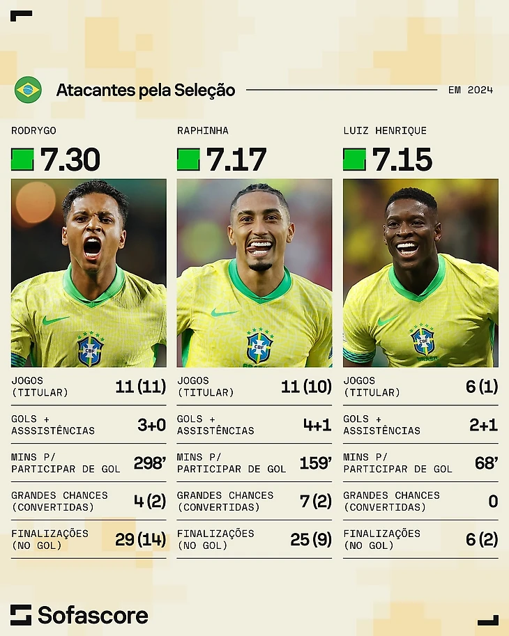 Нападающие -Рафинья (Барселона), Винисиус Жуниор и Эндрик (оба Реал), Савиньо (Манчестер Сити), Жоао Педро (Брайтон), Эстевао (Палмейрас)