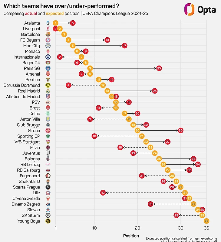 Перед стартом нового формата ЛЧ статистическая компания Opta использовала суперкомпьютер и провела симуляцию всего лигового этапа. Позади пять туров и теперь сравнили, какое место занимала та или иная команда в их прогнозах и на каком идет прямо сейчас.