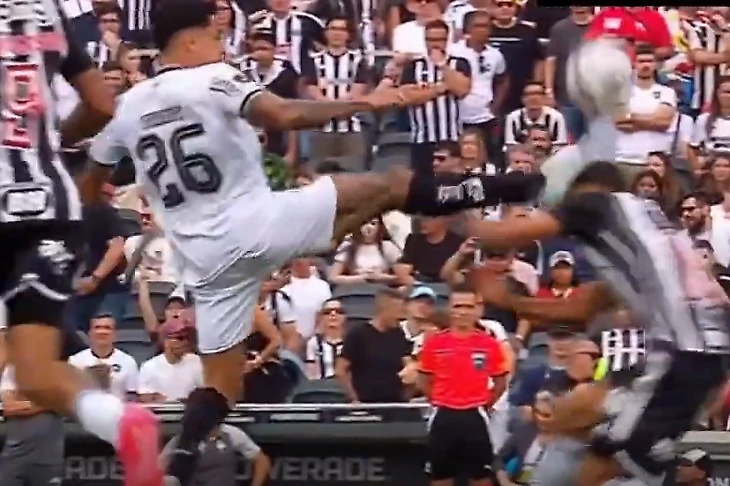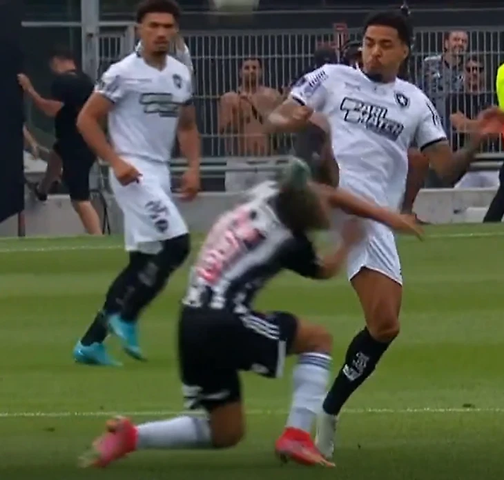 На 54' пытаясь выбить мяч из штрафной, капитан «Ботафого» Марлон Фрейтас чуть не вырвал ногу того самого Варгаса — но судья (в отличие от меня) не увидел нарушения. Позволю вам оценить эпизод самостоятельно: