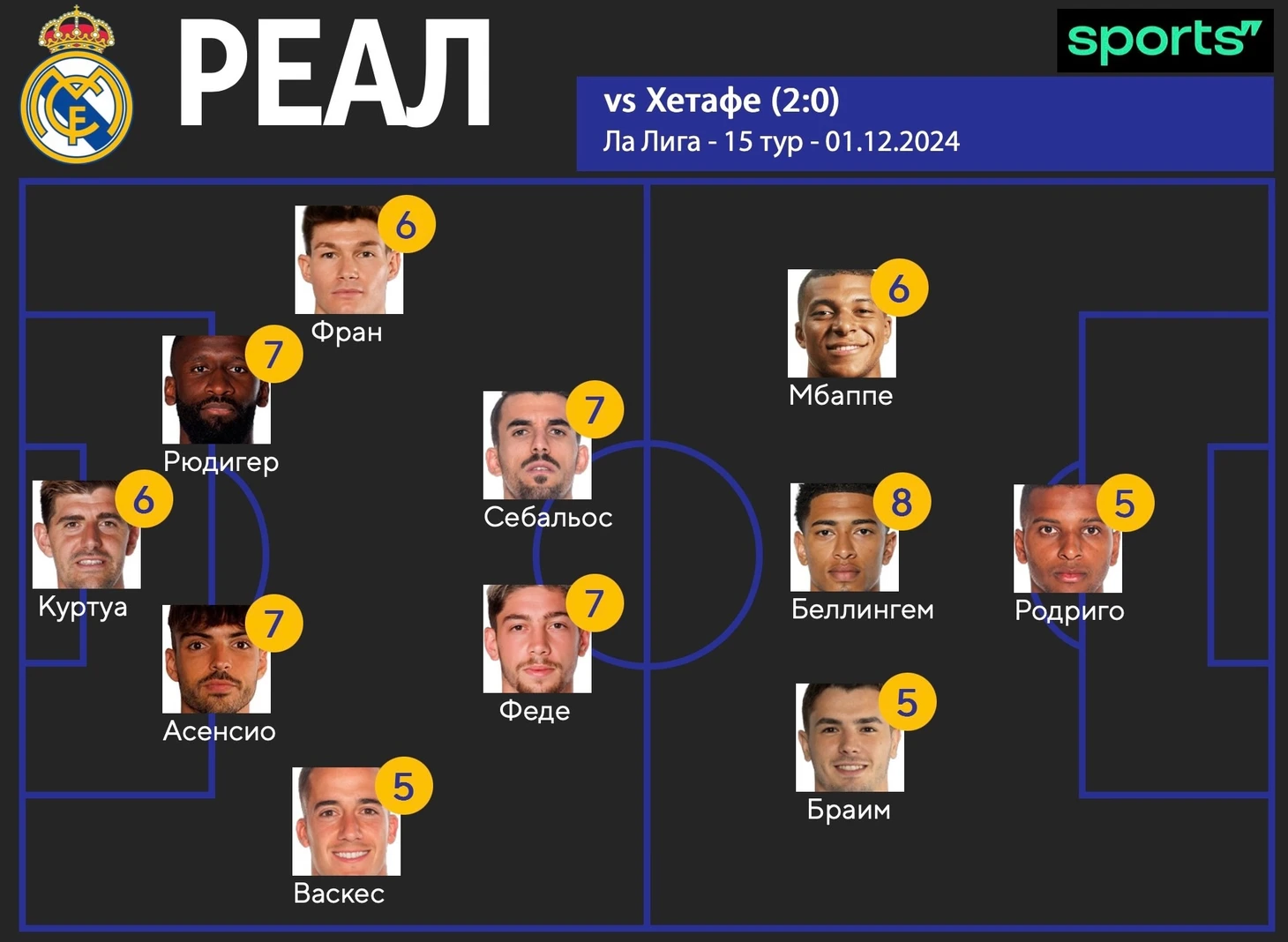 Тибо Куртуа – 6. У «Хетафе» было два опасных удара по воротам, но оба угодили в крестовину. В целом, у Тибо опять не было особой работы в матче Ла Лиги. Бельгиец отыграл свой 250-й матч за «Мадрид» на ноль.