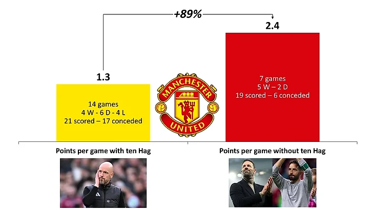 Фанаты «МЮ» нарисовали картинку, в которой сравнили среднее количество набранных очков при Тен Хаге и при Ван Нистелрое/Амориме. Их количество выросло с 1,3 до 2,4, за 7 матчей без Эрика «Юнайтед» ни разу не проиграл, а забил практически столько же (21 против 19), сколько за 14 предыдущих игр.