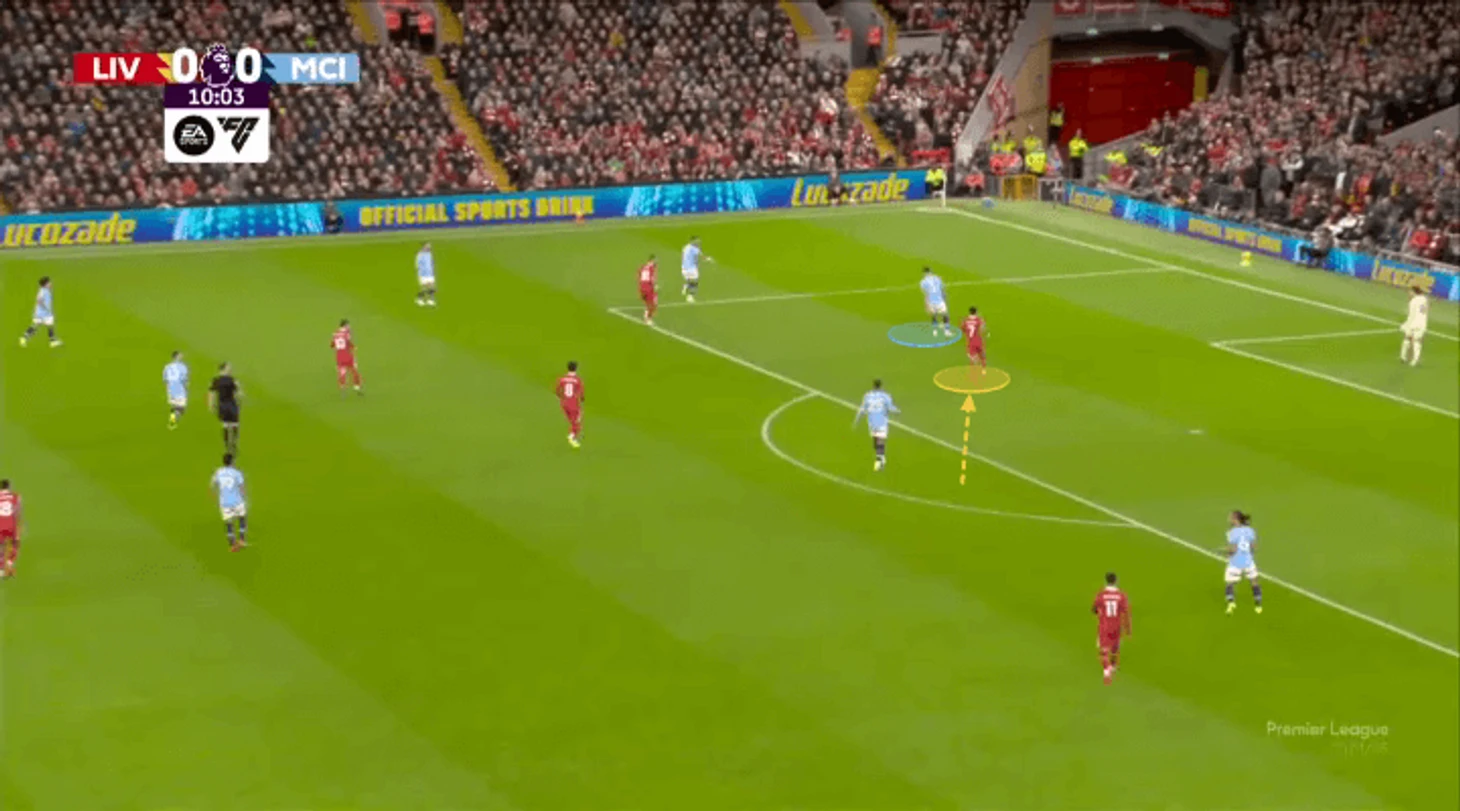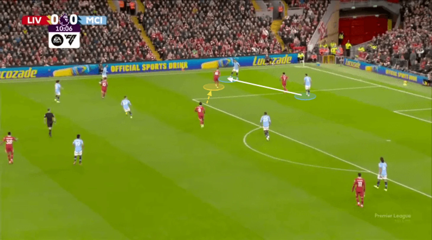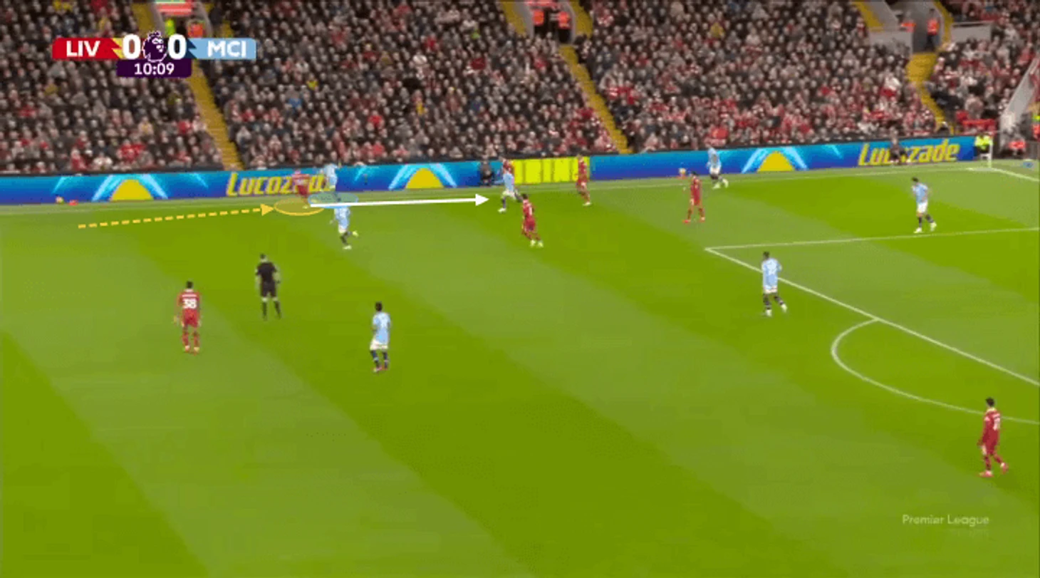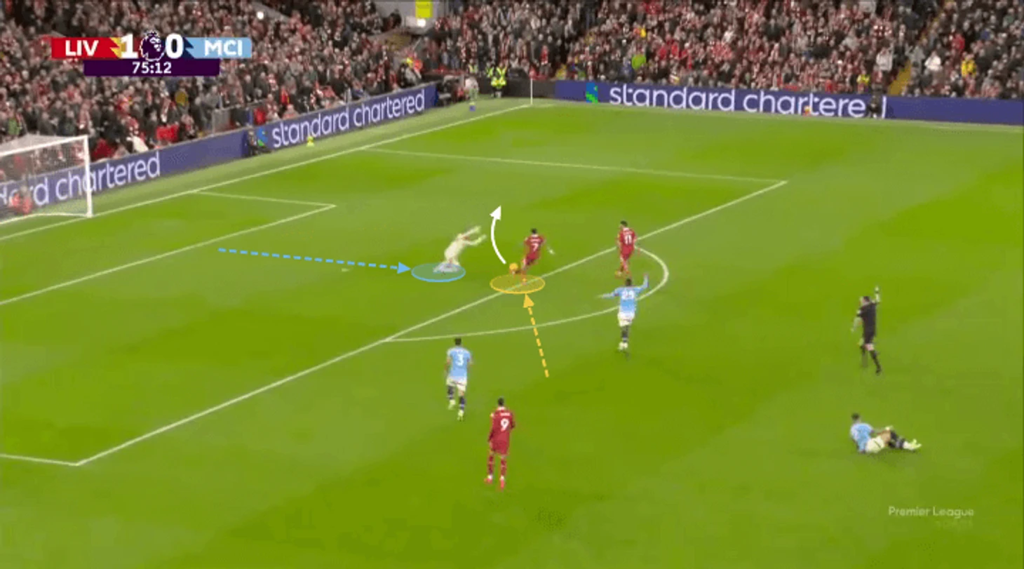 Уокер отдает пас вперед на Бернарду Силву, который под давлением Алексиса Мак Аллистера уклоняется от мяча и пропускает его через себя на Льюиса. Робертсон в этот момент находится в 10 метрах от Льюиса.