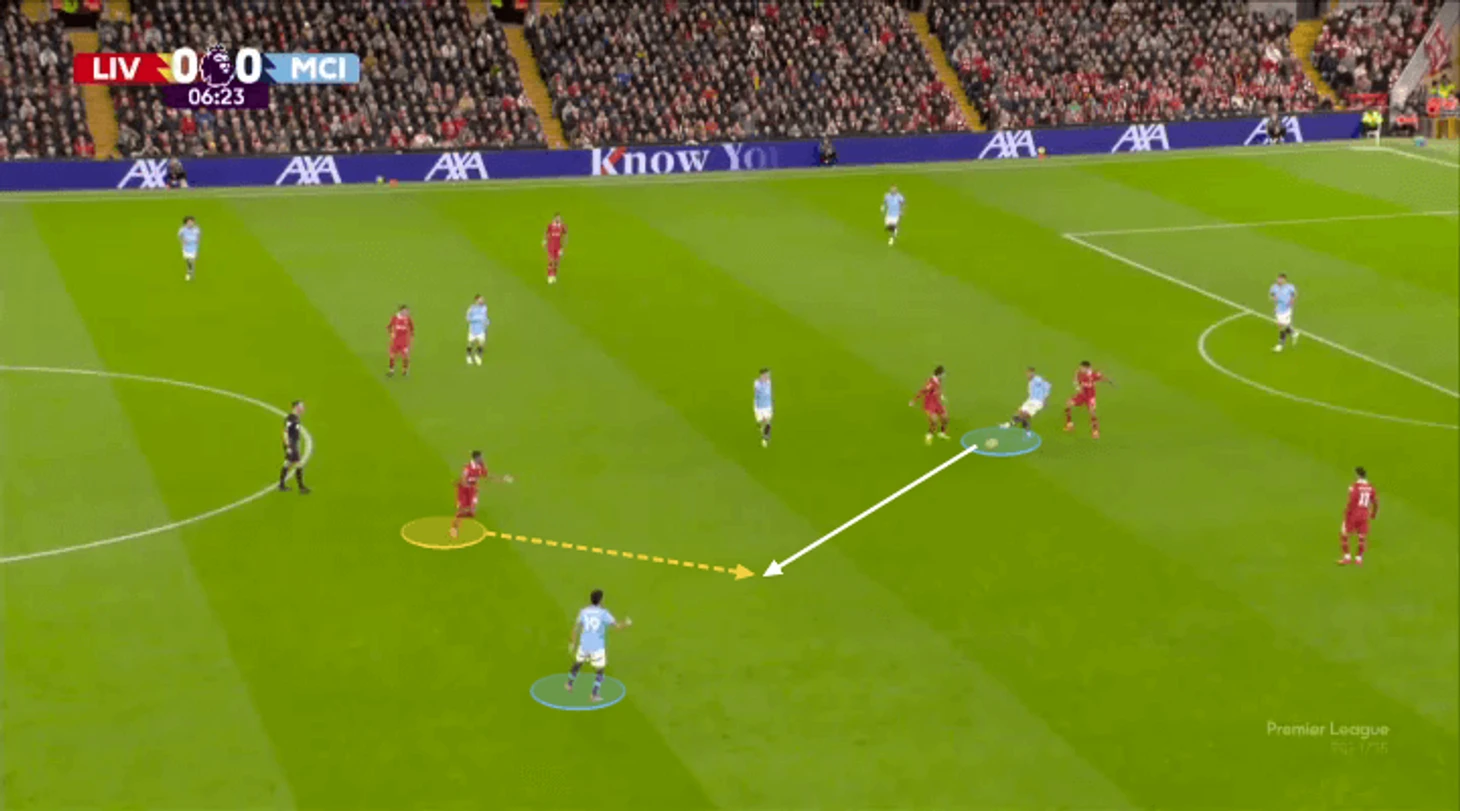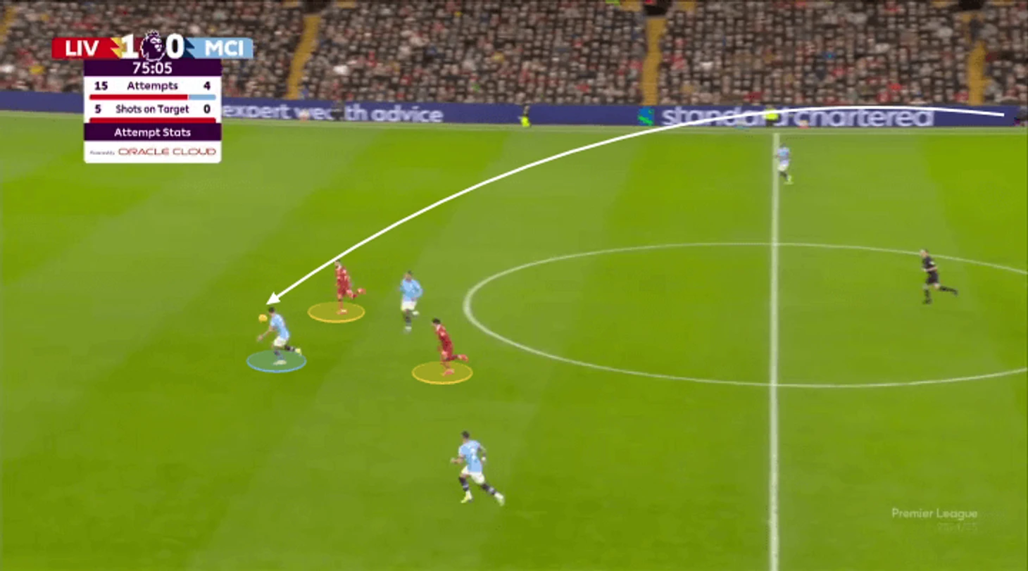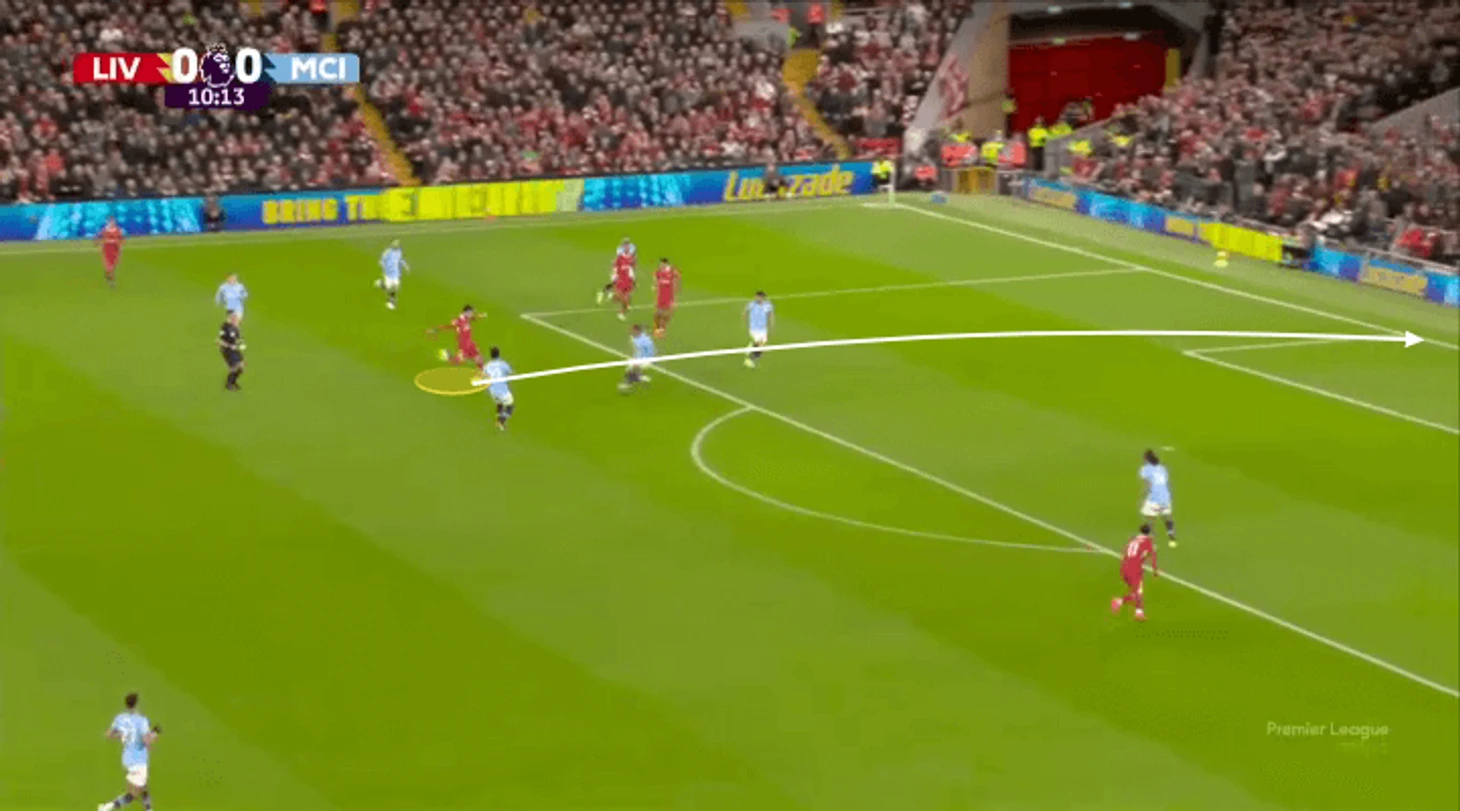 Уокер отдает пас вперед на Бернарду Силву, который под давлением Алексиса Мак Аллистера уклоняется от мяча и пропускает его через себя на Льюиса. Робертсон в этот момент находится в 10 метрах от Льюиса.