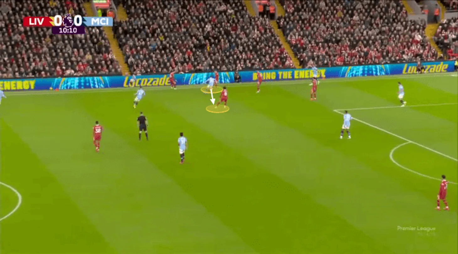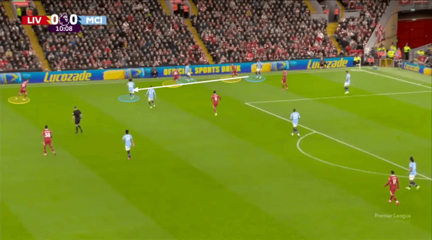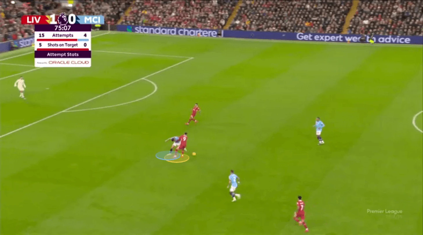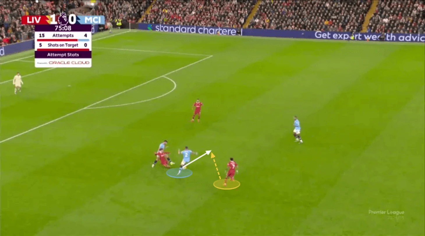 Уокер отдает пас вперед на Бернарду Силву, который под давлением Алексиса Мак Аллистера уклоняется от мяча и пропускает его через себя на Льюиса. Робертсон в этот момент находится в 10 метрах от Льюиса.