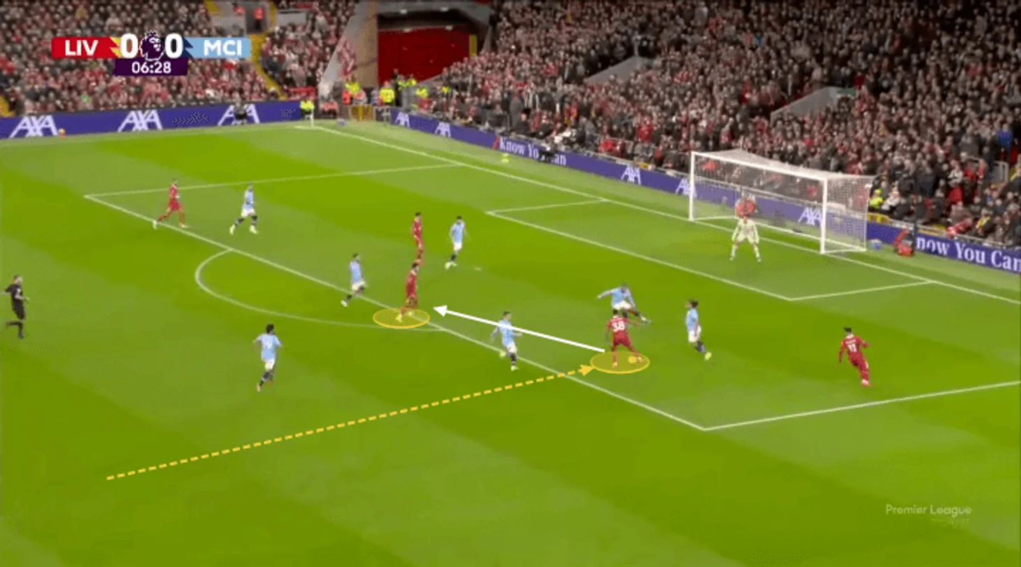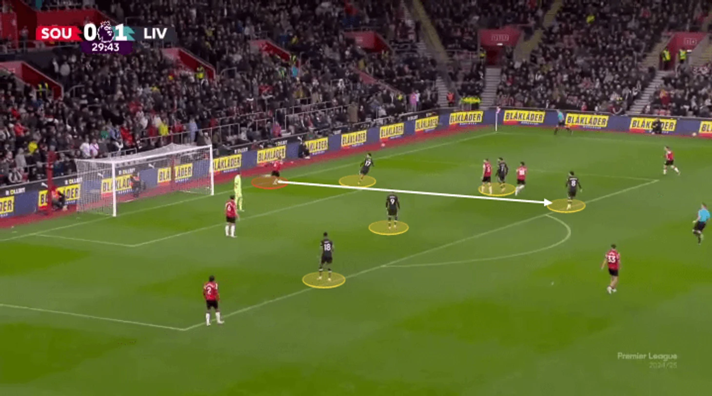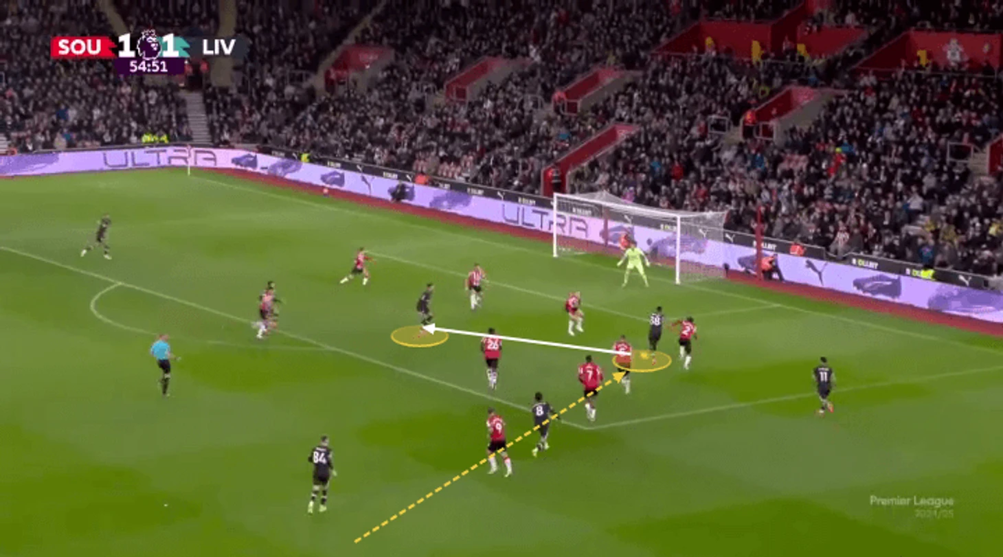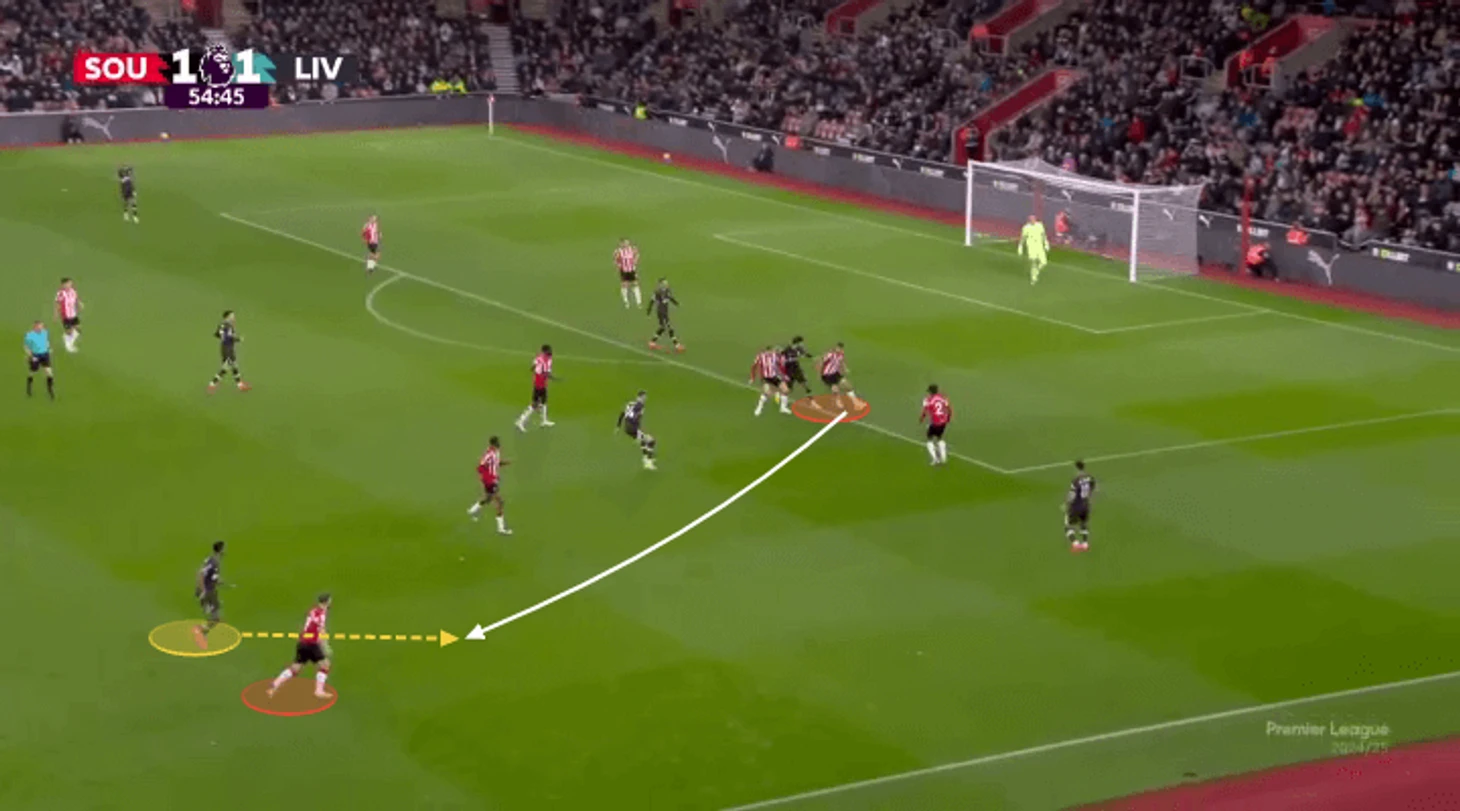 И снова в этой комбинации не было паса. Это был крайний пример, но в нем явно прослеживаются знакомые закономерности. Против «Саутгемптона» Райан Гравенберх продвинулся вперед справа, чтобы перехватить пас из обороны, затем ворвался вперед и сыграл поперек на Нуньеса, который пробил неточно.