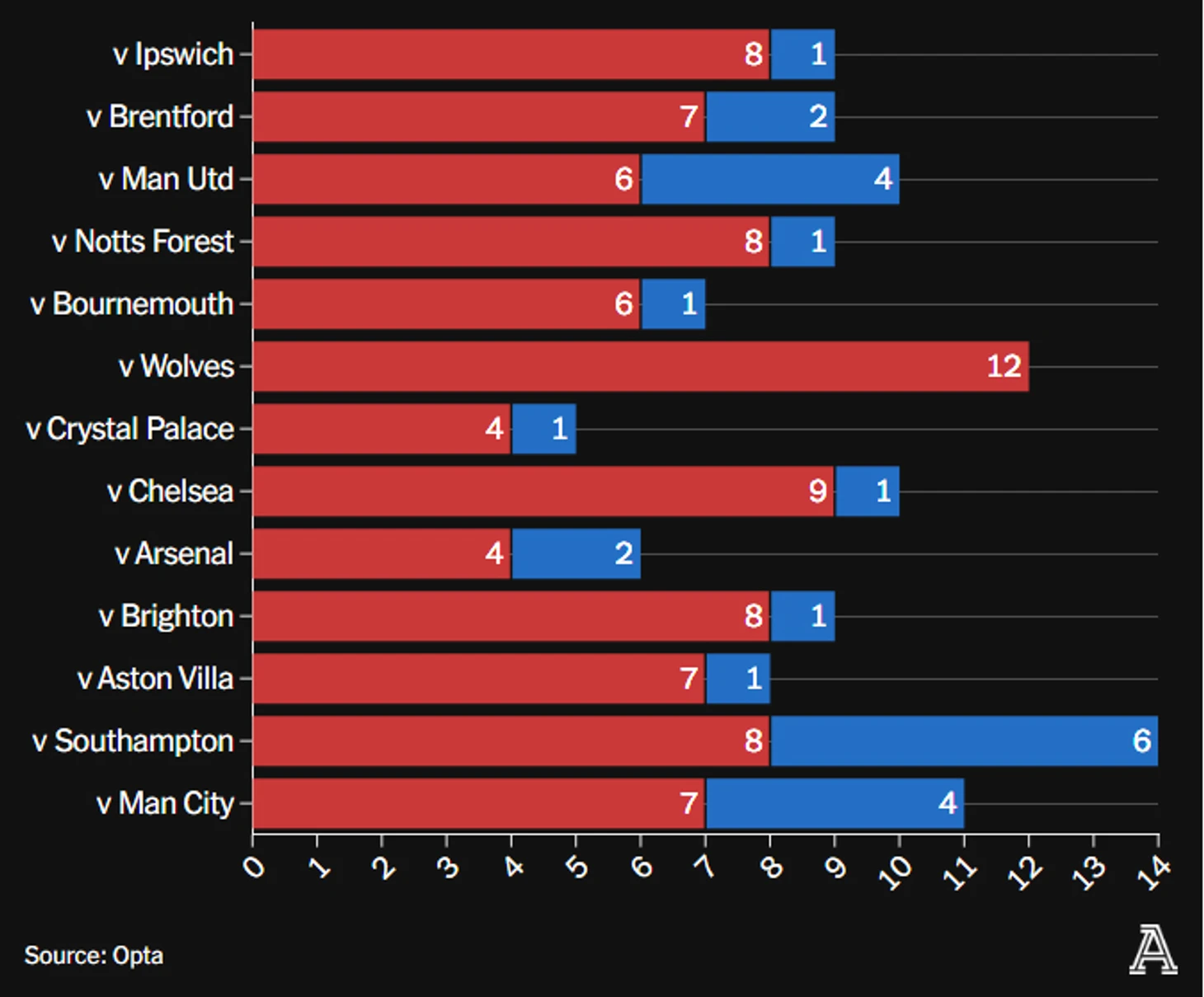 Пример выше не закончился ударом из-за фола Ортеги, но статистика не удивляет, когда наблюдаешь за игрой «Ливерпуля». Правый защитник Конор Брэдли получил восторженные отзывы за подкат под Килиана Мбаппе в победе над «Реалом» в середине недели, но у «Ливерпуля» большие подкаты обычно происходят на более высоких позициях. Эндрю Робертсон подкатился под Рико Льюиса вчера, и это хороший пример.