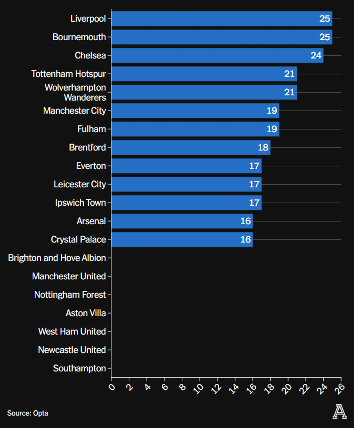 Высокие возвращения мяча, закончившиеся ударом, АПЛ 2024/25