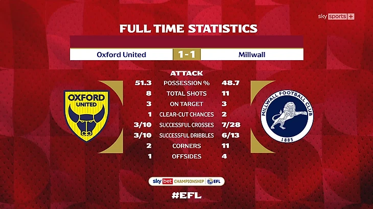 Статистика, которая, очевидно, охватывает всю игру, делает восприятие действительно реалистичным. «Оксфорд» владел мячом 51,5% времени. Обе команды имели по три удара в створ. У гостей было 11 угловых против двух у хозяев. У «львов» было 27 касаний в чужой штрафной, а у «желтых» - только 11. «Юнайтед» сделали 48 выносов мяча из обороны против 18 у лондонцев. Это говорит о том, что «Оксфорд» еще недостаточно их напряг. Статистика ожидаемых голов поддерживает ничейный итог 1-1. У «Оксфорда» 0,9 xG, у «Миллуолла» – 0,88 xG.