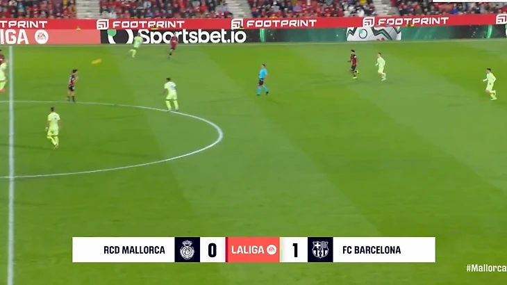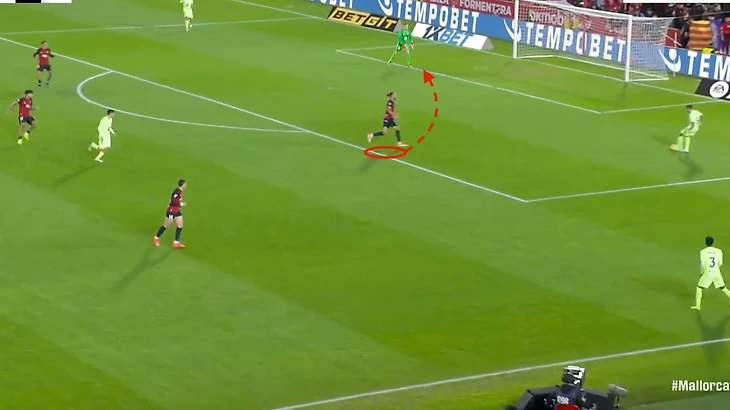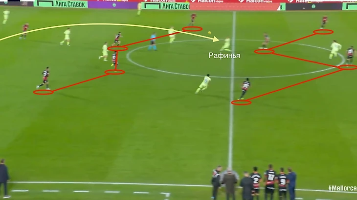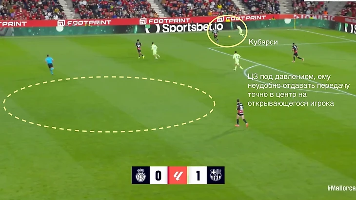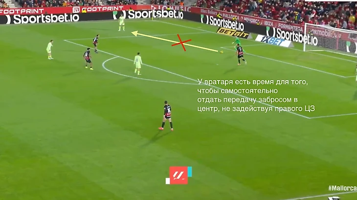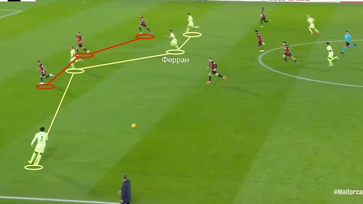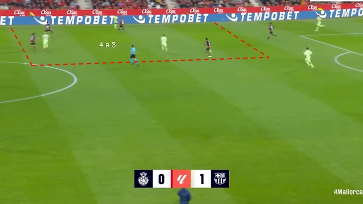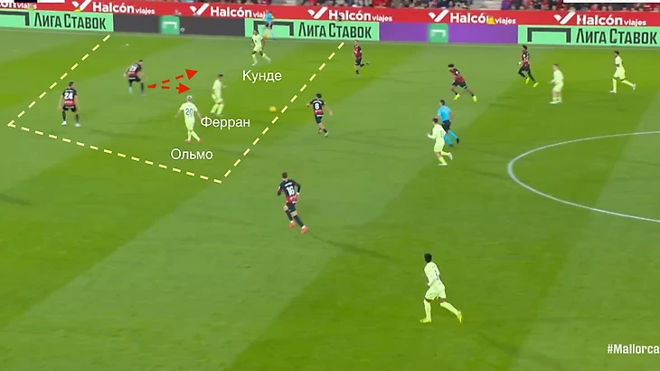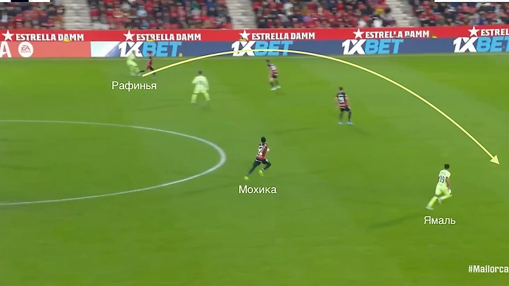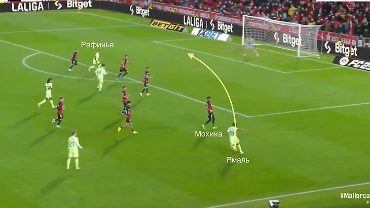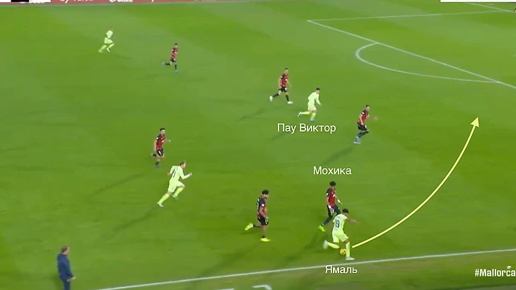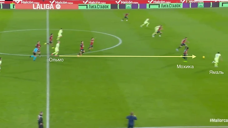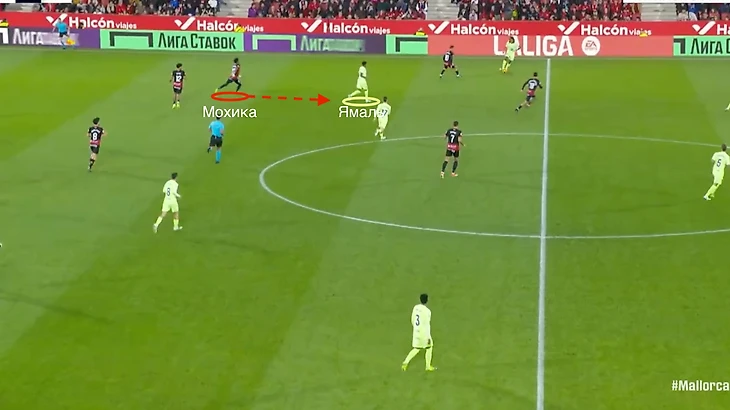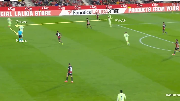 В данном эпизоде Кунде нашел выход через Ольмо, а тот скинул на Ямаль. При этом крайний защитник «Мальорки» Мохика, который в этой встрече играл персонально по Ламину, оказался в ситуации 1 в 2.
