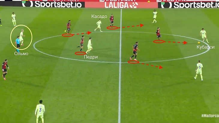 Таким образом, сложилась ситуация 5 в 5 с небольшим коридором по центральной оси, который открылся благодаря действиям Педри и Касадо, слегка растянувших пару центральных полузащитников соперника. Этого «слегка» хватило для Кубарси, чтобы отдать вертикальную передачу на Ольмо, отрезав две линии.