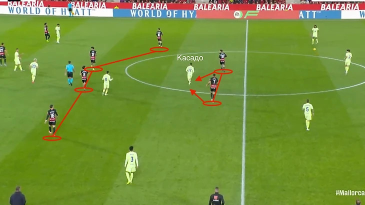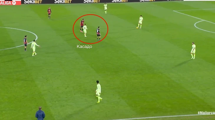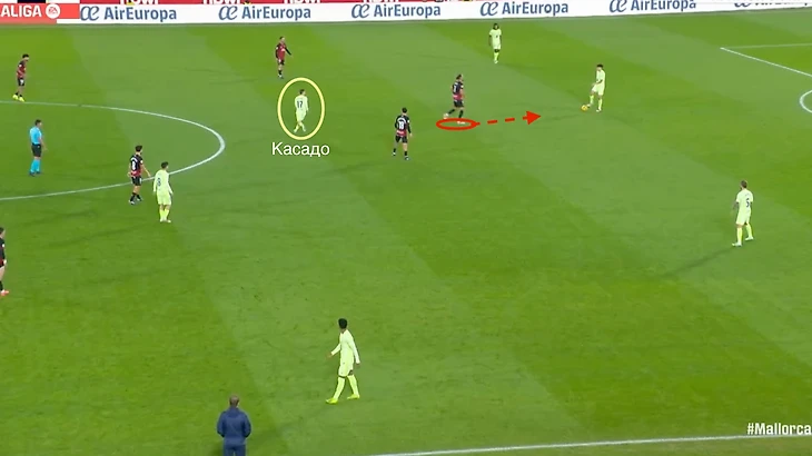 При более низком расположении обороны «Мальорки» Касадо вместе с Педри пробовали манипулировать средней линией соперника. Таким образом, создавая вектор передачи на Ольмо.