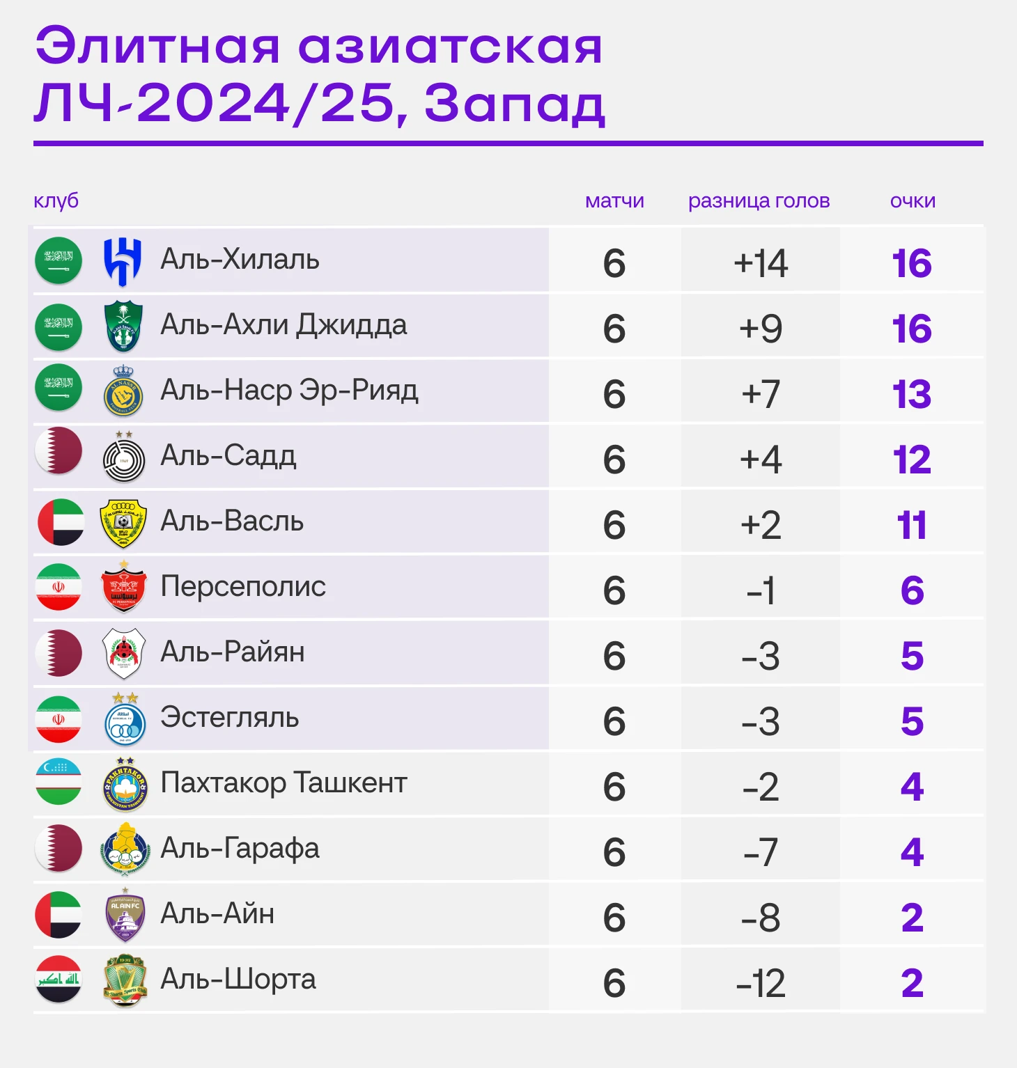На Западе лидируют три саудовских клуба. Все они уже обеспечили себе плей-офф, поэтому Криштиану Роналду даже не сыграл в шестом туре. Португальца готовят к матчу с лидирующим в чемпионате «Аль-Иттихадом» – эта игра уже в пятницу, между командами восемь очков. Без Криштиану «Аль-Наср» проиграл дома катарскому «Аль-Садду» (1:2).