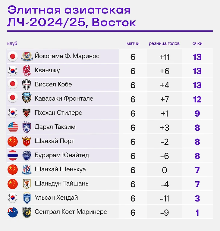 Японские и корейские клубы заняли топ-5, две китайских команды из трех – вне восьмерки плей-офф. «Сентрал Кост Маринерс» – единственные из 24 участников, кто лишился шансов на 1/8 финала.