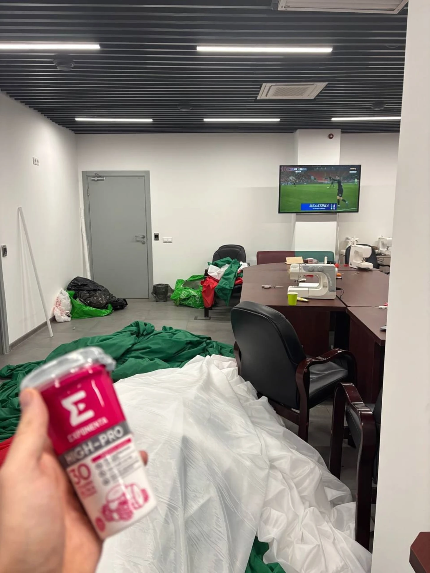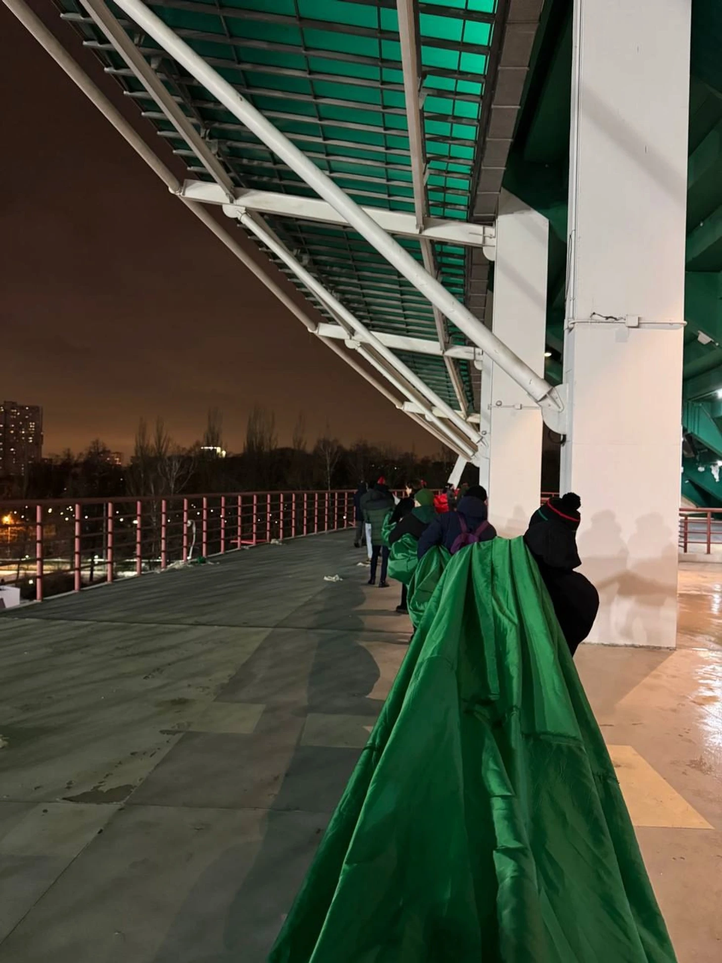 Параллельно работали над фанатом с флагом. Учитывая сложные погодные условия осенью и размер рисунка, пришлось помучаться. Но успели в срок, отдельное спасибо всем болельщикам, которые помогали расходниками: помимо собственно баллонов краски (а их было 111 штук), в работе необходимы маркеры, перчатки, скотч и прочая канцелярия, которая быстро заканчивается в процессе создания.