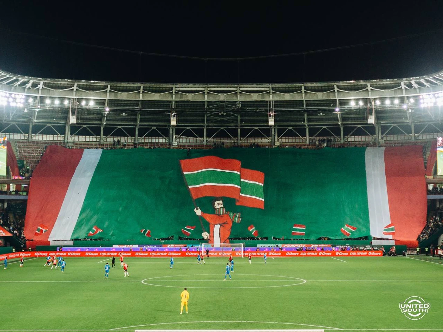 Всё началось в 19:22, когда полотно начало разворачиваться на верхнем ярусе. Уже выходя на поле, футболисты «Локомотива» видели красно-бело-зелёную стену. А на первых минутах игры Южная трибуна взметнулась с зарядом «Это наше Черкизово!»