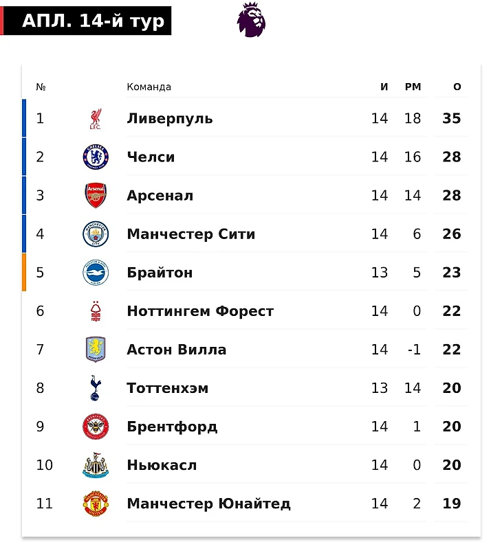 У «Ливерпуля» уверенные плюс семь от «Челси» и «Арсенала», до девяти очков отставание сократил «Сити». «Вилла» придвинулась ближе к топ-4, «Ньюкасл» и «МЮ» застряли в середине. Команде Рубена Аморима вообще грозит 13-я позиция после матчей «Фулхэма» и «Борнмута».