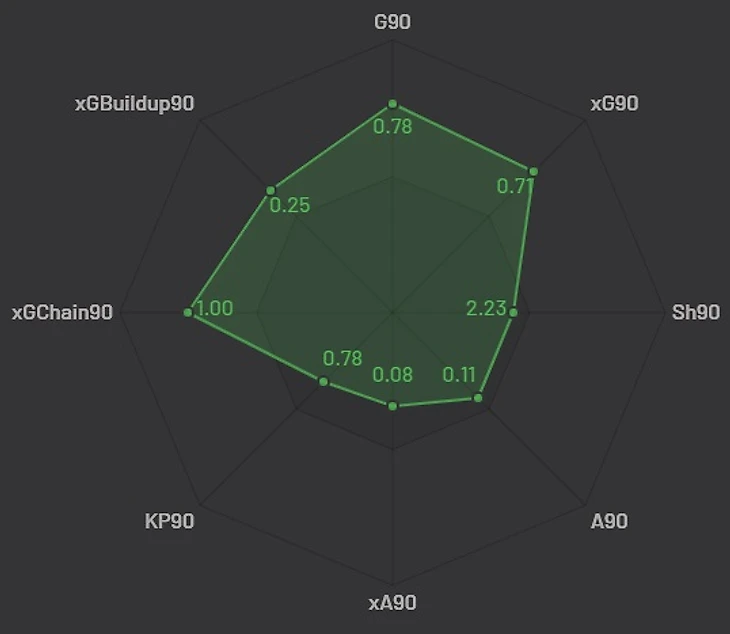 Третья часть состоит из xGChain и xGBuildUp. Первый показатель про вовлеченность игрока в атаки, завершаемые ударом его команды. Второй показатель практически про это же. Однако, в нем исключаются бьющий игрок и игрок отдавший передачу под удар. Разница между показателями говорит о нацеленности Виссы на завершающую стадию.