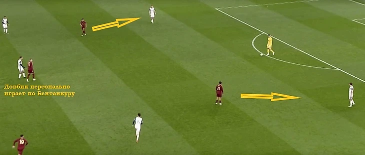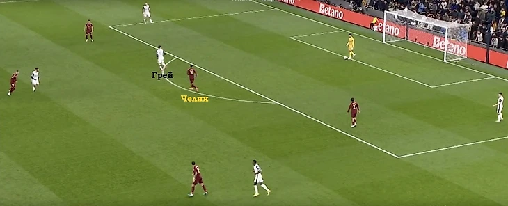 Линия прессинга «Ромы» геометрически выстраивалась в треугольник с вершиной внизу. Дибала играл по Дэвису, Эль-Шаарави по Дрэгушину. Персоналки были на столько смелыми, что некоторые игроки оказывались в радикальных позициях. Крайний защитник Зеки Челик сопровождал Арчи Грея до чужой штрафной. Например, как здесь.