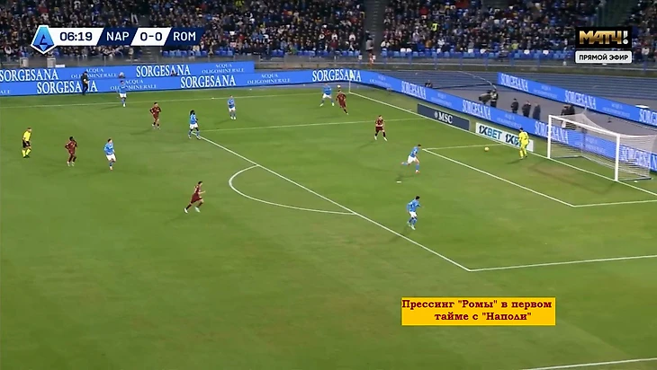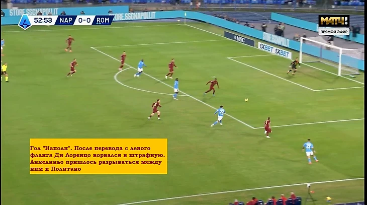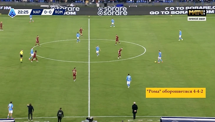 В игре с «Наполи» оттолкнуться от дна не получилось. Первый тайм против неаполитанцев – «старый добрый Раньери». 4-2-3-1 с мячом, где под Довбиком играла тройка Пизилли – Пеллегрини – Эль-Шаарави (слева направо). А крайние защитники располагались асимметрично – Анхелиньо-выше – ближе к центральной линии, Челик – ниже. Без мяча компактные 4-4-2. Роль второго нападающего досталась Пеллегрини.