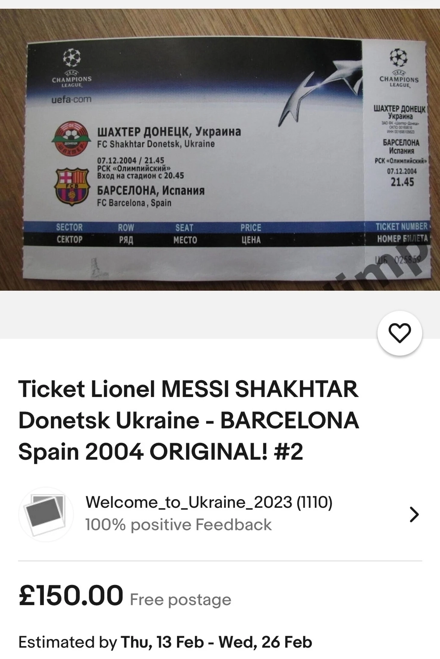 Заурядный матч Лиги чемпионов стал знаковым, ведь в тот день великий Лионель Месси впервые сыграл в главном клубном турнире Европы. На eBay продается использованный билет на ту встречу «Шахтера» и «Барсы», ценник серьезный – 150 фунтов стерлингов.