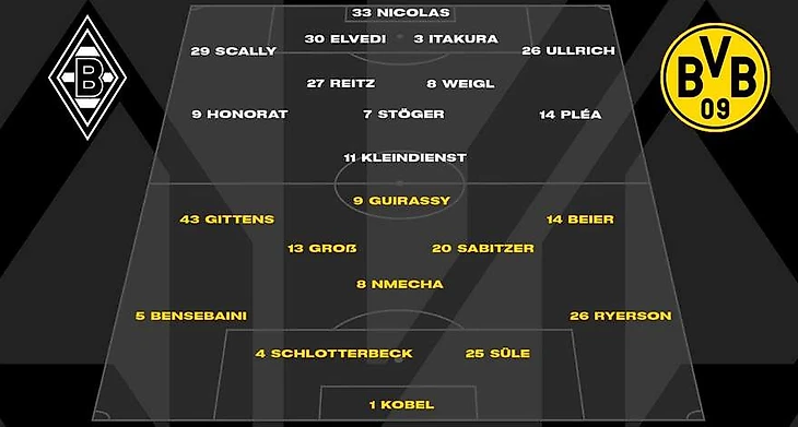 А субботним вечером в Менхенгладбахе состоялось «дерби» двух «Боруссий»: менхенгладбахской и дортмундской. Главный тренер хозяев Херардо Сеоане после поражения на прошлой неделе от «Фрайбурга» внес два изменения в стартовый состав: Мориц Николас, Ко Итакура, Лукас Ульрих, Джо Скалли, Нико Эльведи (вместо Марвина Фридриха), Кевин Штегер (вместо Робина Хака), Юлиан Вайгль, Рокко Райц, Франк Онора, Тим Кляйндинст и Алассан Плеа. Однако изменений в тактической расстановке не последовало, и поэтому «жеребята» начали игру по схеме 4-2-3-1, в которой Штегер играл в основном в центре атакующей цепочки из 3 игроков, сковывая при этом Нмечу. А после того, как Гиттенс выиграл первые 7 единоборств, то правый защитник Гладбаха Скалли стал получать постоянную поддержку от своих партнеров: против Гиттенса всегда было два игрока хозяев.