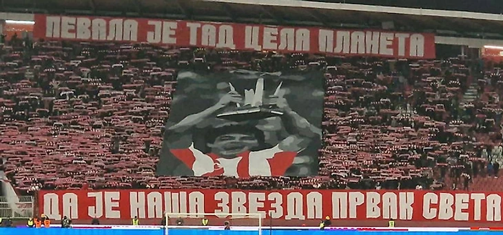 И это несмотря на то, что при счете 1:0 в концовке первого тайма у красно-белых был удален Деян Савичевич, который спустя несколько месяцев уедет в «Милан» заменять замученного травмами Ван Бастена. После финального свистка капитан «Црвены Звезды» Илия Найдоский поднял надо головой очередной трофей красно-белых – именно этот кадр запечатлели «Делие» в своем перфомансе в домашнем матче против «Текстилаца» из города Оджаци в минувшую субботу. Девизом хорео было «Тогда вся планета пела, что наша «Звезда» – чемпион мира!».