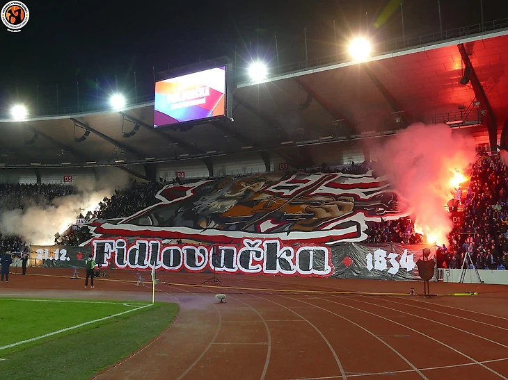 Закроем сегодняшний обзор очень масштабным рассказом с обилием фотографий. В прошлом выпуске я уже анонсировал выезд года, который ультрас пражской «Славии» планировали пробить в город Оломуц. Да и вообще прошлую неделю болельщики красно-белых провели на топовом уровне, так как перед выездом в Оломуц они успели посетить гостевую игру в Остраве против местного «Баника». Но начнем с большой баннера «Фидловачка» от ультрас «Баника», на котором был изображен неизвестный скрипач.