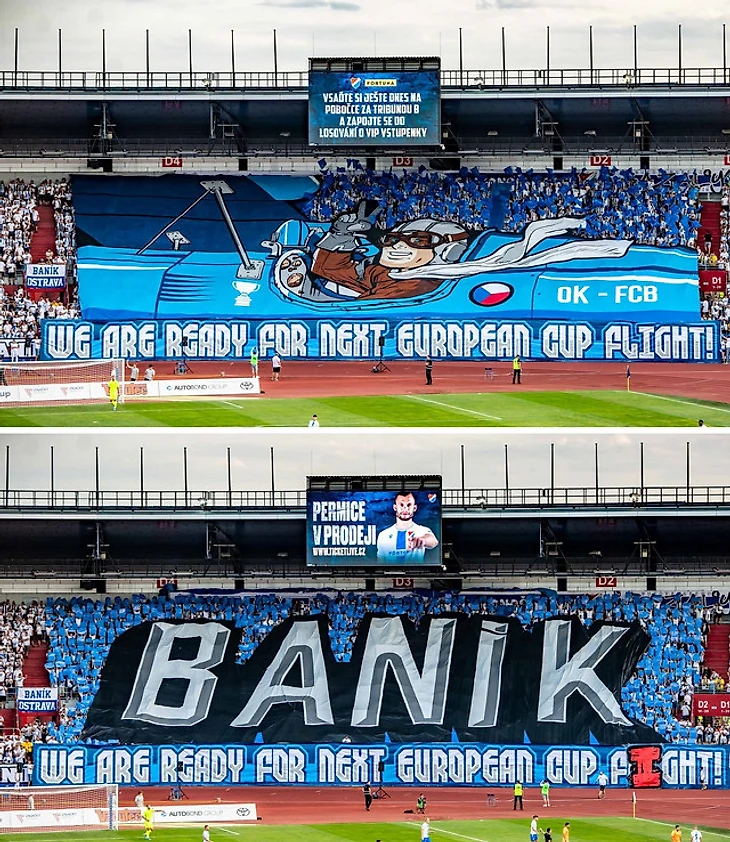 Но сам баннер был тонким ответом на перфоманс ультрас «Баника» прошлым летом, когда в рамках квалификации Лиги Конференций чехи принимали на своем поле армянский «Урарту». В той игре фэны из Остравы развернули двойное хорео, в первой части которого фигурировал как раз самолет с клубной аббревиатурой «OK-FCB», а также подписью «Мы готовы к следующему еврокубковому полету!». А во второй части баннер с самолетом сменился на баннер с названием команды «Баник», а из последнего слова в подписи к баннеру пропала одна буква, благодаря чему слово «flight» сменилось на «fight», а настрой чешских фанатов поменялся с готовности к следующему еврокубковому полету на готовность к следующей еврокубковой драке.