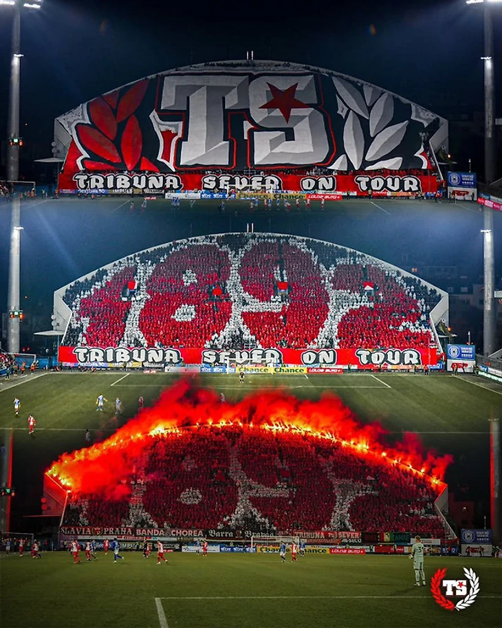 Все это было в первой части масштабного представления, тогда как вторая включила в себя двойное хорео под лозунгом «Трибуна Север на выезде», где сначала был развернут баннер с аббревиатурой этой самой «Трибуны Север», а затем плашками выложен 1892 год, когда и была основана «Славия». Про историю ее создания более подробно вы можете прочитать в этом посте по ссылке. В конце концов, финальный перфоманс был подсвечен примерно 50 файерами по верхней границе полуовальной трибуны стадиона в Оломуце.