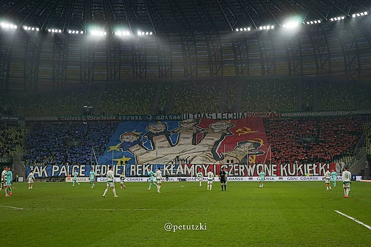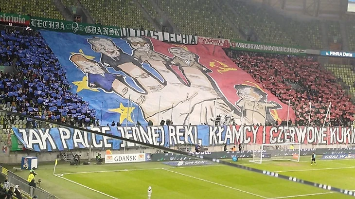 В чемпионате Польши «Лехия» из Гданьска в последнем матче перед зимней паузой принимала на своем поле «Шленск» из Вроцлава. Кибицев обоих клубов связывает крепкая дружба, об истории которой я уже рассказывал в этом посте. Но на этот раз главным инфоповодом матча стало не взаимоотношение фанатов, а польская политика: ультрас «Лехии» презентовали масштабную оправу, которая гласила «Как пальцы одной руки – лжецы и красные марионетки». На каждом из пальцев растопыренной пятерни была кукла-напальчник с лицами известных политиков, а фоном всему этому служили флаги Евросоюза и СССР.