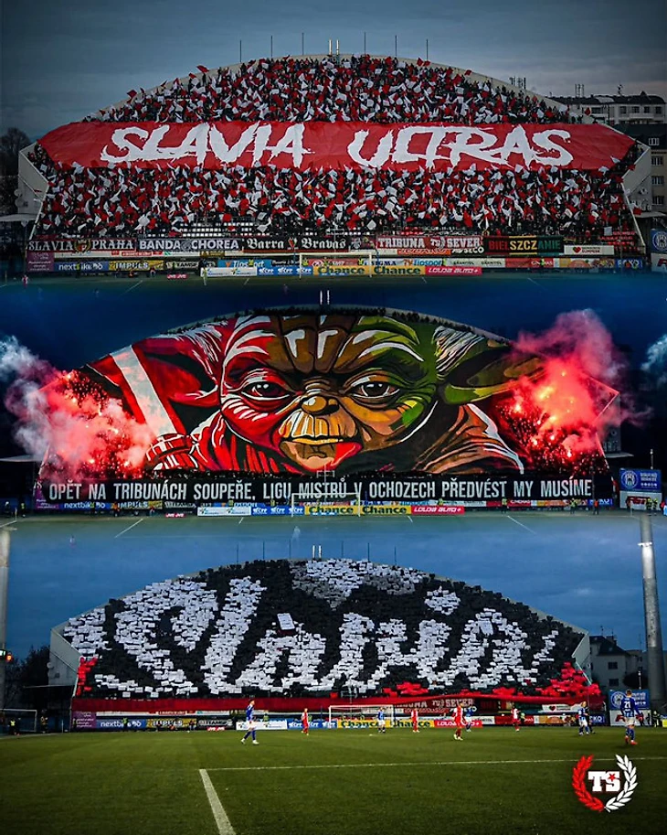 «Славия» же выиграла у «Баника» 1:0 и отправилась в Оломуц, где ее фэнам предстоял тот самый выезд года в гости к местной «Сигме». 3.300 столичных фанатов (а вместе с ним полтысячи польских друзей: 400 фанатов «Заглембе» (Сосновец), 100 фэнов «БКС» (Бельско-Бяла) и 14 болельщиков «Чувая» из Пшемысля) на спецпоезде отправились из Праги со станции «Эден», где расположен домашний стадион «Славии», и уже менее чем через 2,5 часа прибыли в Оломуц. Там они, облачившись в куртки черного цвета, единым маршем прошли до 12-тысячного стадиона «Андрув», где заняли целый заворотный вираж. А дальше в течение 90 минут матча были сразу 5 классных выездных перфомансов, среди которых «Славия Ультрас», «Славия» и огромное изображение мастера Йода из «Звездных войн» под девизом «Опять чемпиону страны приходится показывать уровень на трибунах соперника».