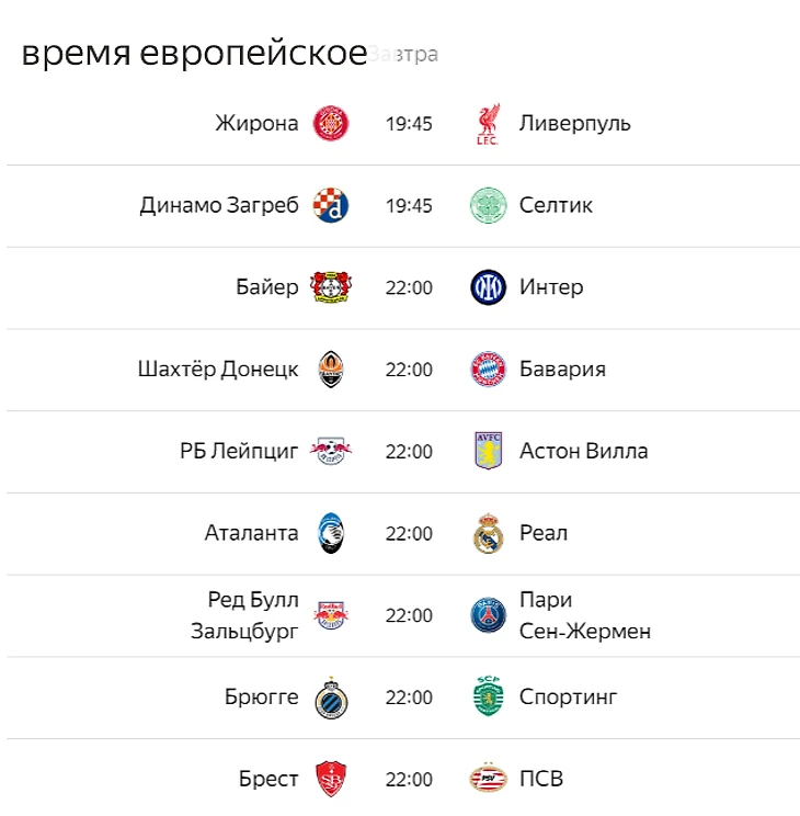 Также в этот вечер нельзя будет пройти мимо матча лидера общей таблицы «Ливерпуля», который сыграет на выезде против «Жироны». Немного позже свои матчи на выезде сыграют : «Бавария» (против «Шахтера»), «ПСЖ» (против «РБ Зальцбурга») и «Астон Вилла» (против «РБ Лейпцига»).