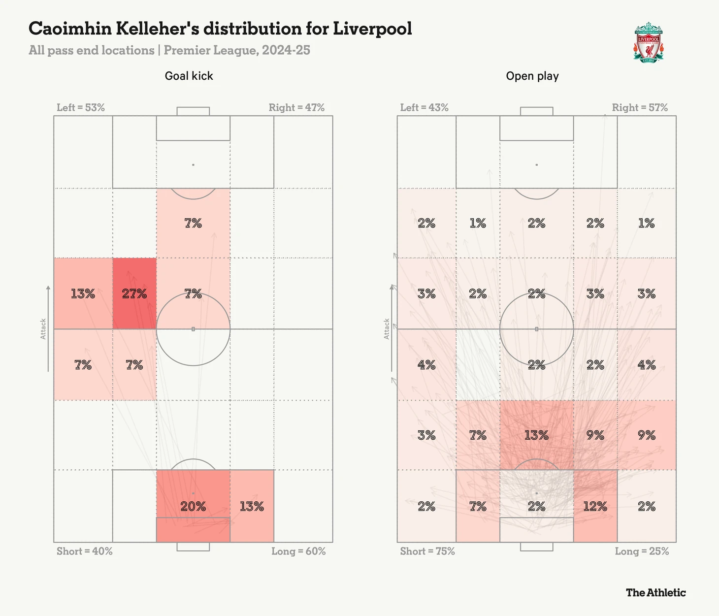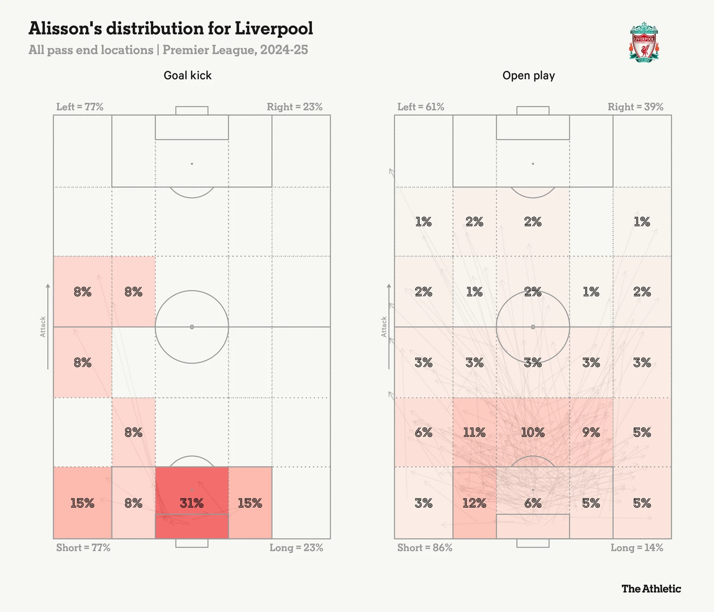 Однако эти цифры говорят лишь о половине истории, о чем свидетельствуют приведенные ниже графики. Очевидно, что Келлехер более агрессивен из двух вратарей в плане распределения мяча, поскольку он играет более длинными и амбициозными передачами вперед. Алиссон чаще перемещает мяч между центральными защитниками и точность его длинных забросов лишь 14% с игры по сравнению с 25% у Келлехера. Он тщательнее выбирает моменты для проявления амбициозности.