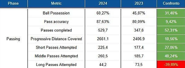 Итак, сперва обозначим то, что сходу бросается в глаза – Мотта совершенно иначе организует контроль происходящего на поле, поскольку отдает предпочтение территориальному доминированию и короткому пасу. Впечатляет рост владения (+31%), большее количество выполненных передач в целом (+52%), и куда более прогрессивная сущность совершаемых передач относительно принимающего (+10%). Сюда же отнесем еще одну деталь – игроки Мотты реже отдают дальние передачи, что характеризует отказ от прежней модели частых забросов вперед вместо попытки низкого билдапа через быстрый пас.