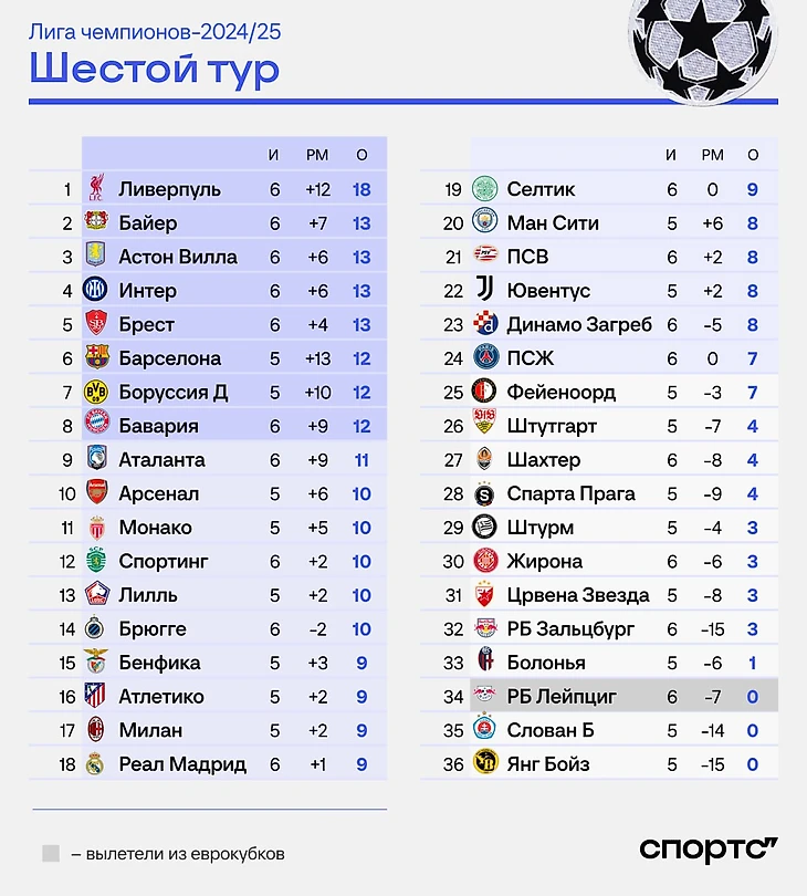 «Ливерпуль» – первый со 100-процентным результатом и уже почти в 1/8 финала, а «Лейпциг» – первые, кого мы закрасили серым, потому что команда после январских матчей закончит евросезон. Напомним, с последних 12 мест ЛЧ теперь вылет в никуда.