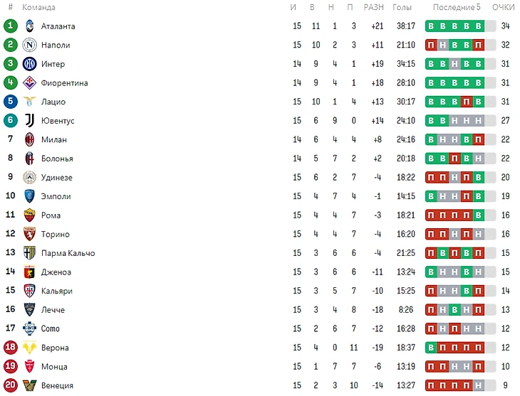 Таким вышел 15 тур. Лидерство Наполи оборвалось, Аталанта наоборот стала лидером, Интер догнал соперников в борьбе за чемпионство, а Фиорентина и Лацио продолжают погоню за лидирующей группой.