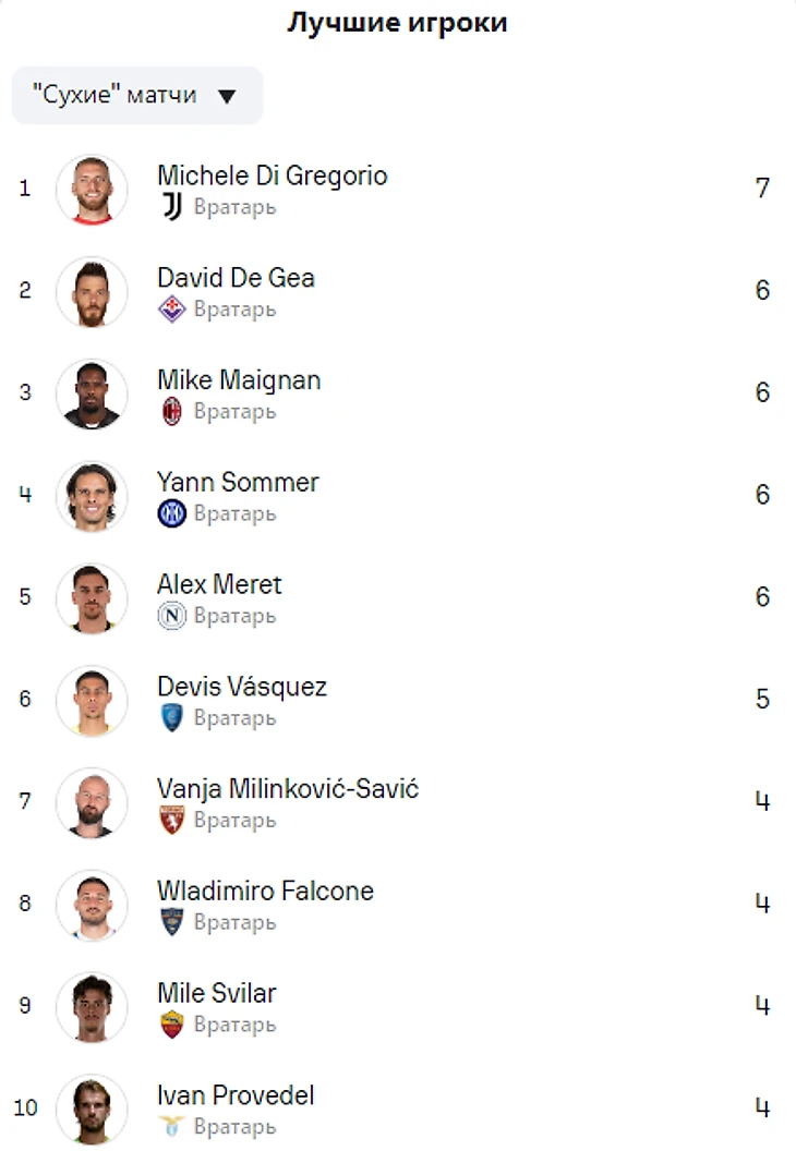Лучшие вратари по количеству «сухих» матчей: