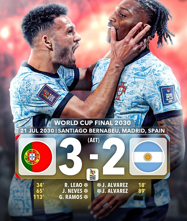 2️⃣ Португалия 3-2 Аргентина – 2030 год, стадион «Сантьяго Бернабеу», Испания