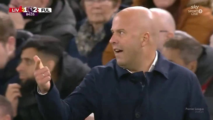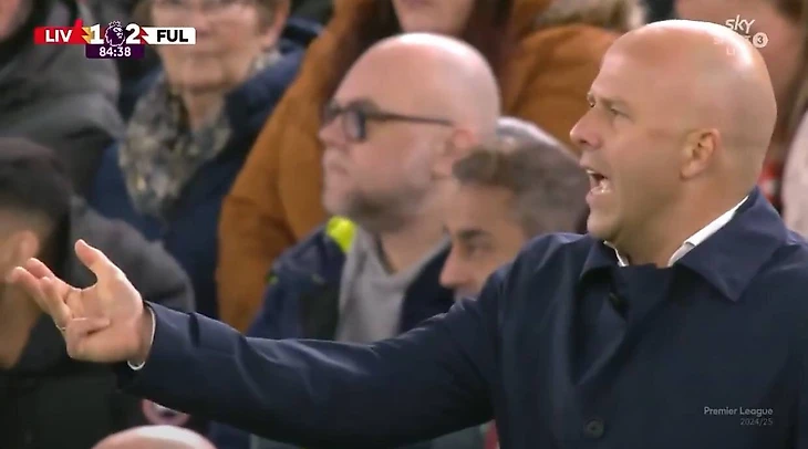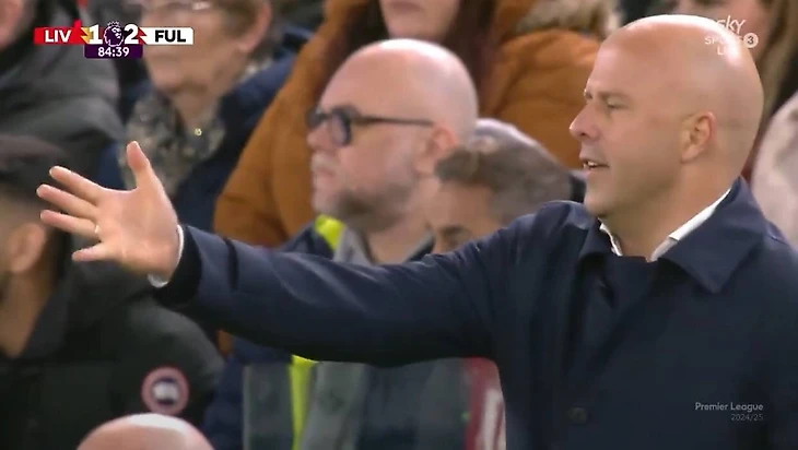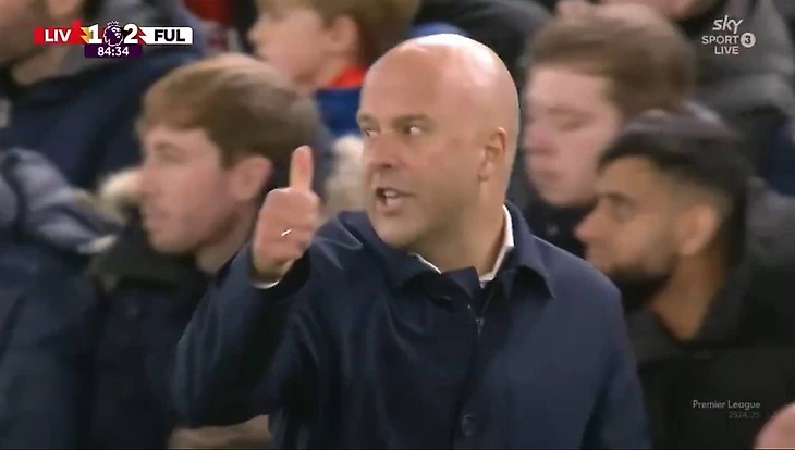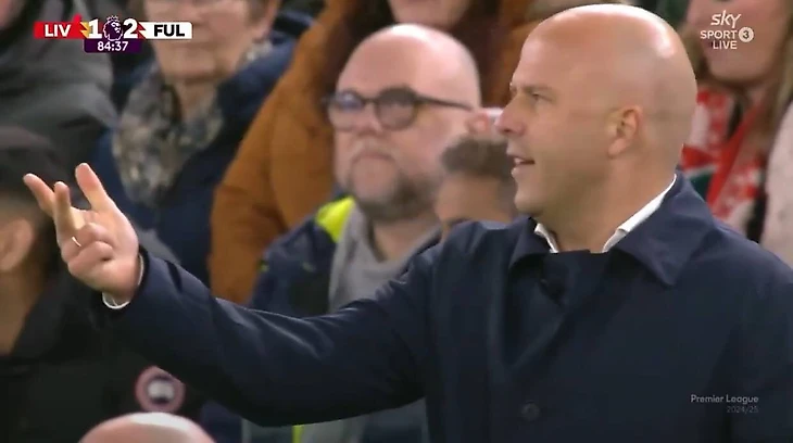 Забавный момент из трансляции матча «Ливерпуль» – «Фулхэм» на 85-й минуте. Оператор выхватил считающего Арне Слота: тренер показывал, сколько секунд вратарь «Фулхэма» Бернд Лено держал мяч в руках.