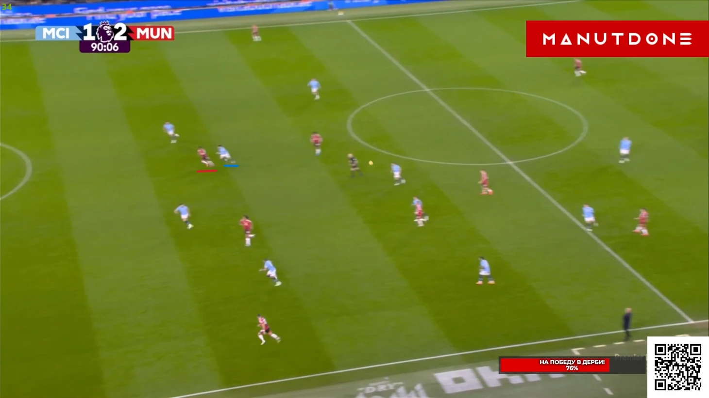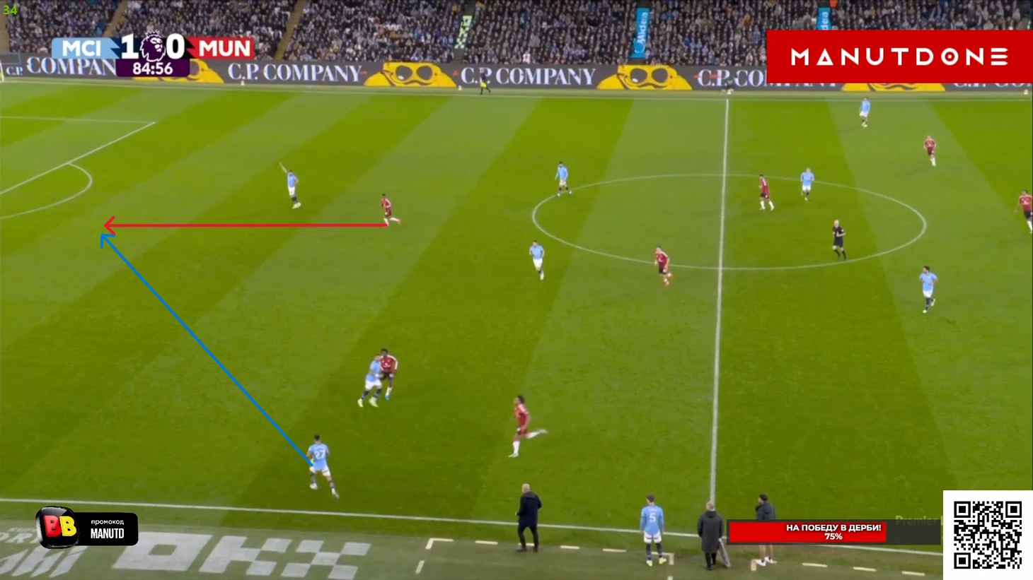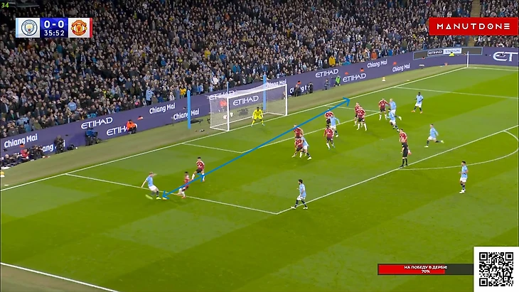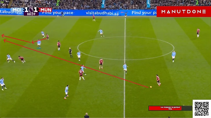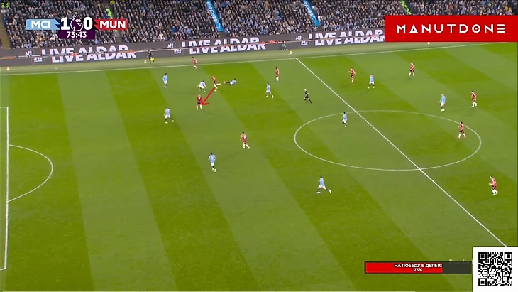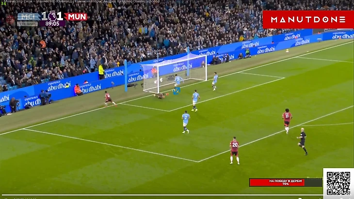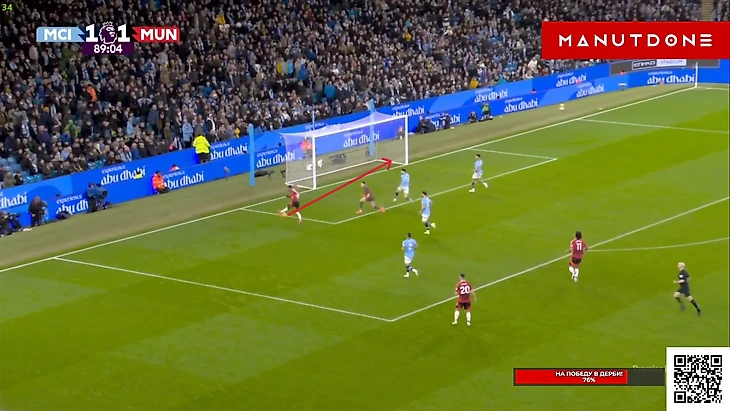 Но Бруну, традиционно для этого сезона, просто не хватило достойного завершения. Как будто бы здесь португалец даже немного спижонил, ведь Эдерсон вышел очень неудачным образом и оставил дальний угол вполне пробиваемым и для удара не «парашютиком», но задним числом, конечно, говорить всегда удобней, поэтому скорей здесь Фернандешу просто не повезло, т.к мяч прошел в сантиметрах от штанги Не стоит умалять и заслуг Мазрауи в этом моменте, который метров 20 пробежал с крепким Доку на хвосте, но таки преодолел его и выдал отличный пас на свободное пространство, что марокканец в этой игре делал не раз. И вот казалось, что лучше момента у «МЮ» сравнять уже не будет, ведь ход игры так или иначе контролировали «горожане», и таких моментов на «Этихаде» у любой команды может вообще не возникнуть, а что бы получилось создать хотя бы 2 таких – это уже абсолютная фантастика, но у «МЮ» получилось создать еще 2... Правда, конечно, в обоих моментах не обошлось без очевидных ошибок «Сити» различной степень серьезности, ведь привоз Нуньеша просто лежит на поверхности, и тут даже разбирать нечего. Просто человек взял, обрезался, а затем в попытках исправиться еще и пенальти привез, хотя в тот момент ситуация уже была не столь опасной, т.к Амад был под острым углом и вдалеке от ворот, поэтому лететь сюда как на пожар, Матеушу было далеко необязательно: