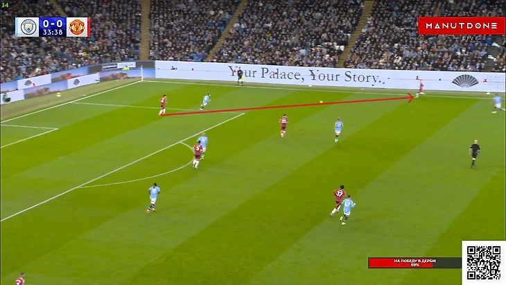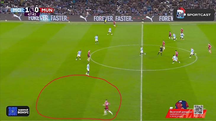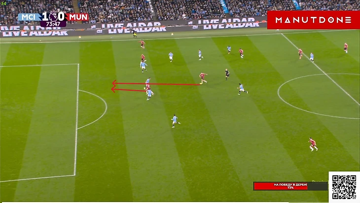 И тут «Сити» банально повезло, что соперника настолько привык атаковать через правый фланг за первый тайм, что даже Бруну тут не увидел просто километр пространства для рывка Далота. Также «Юнайтед» стал чуть агрессивнее и выше действовать в отборе, иногда даже чересчур. Вот, например, Лисандро выдернулся чуть ли не к чужой трети, и вполне успешно: