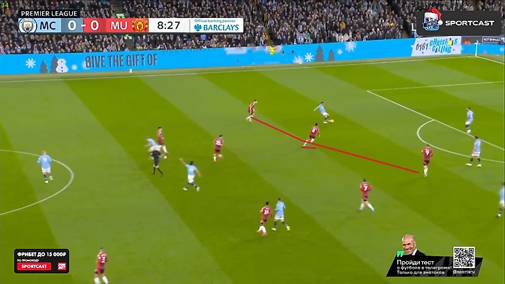 Еще хотелось бы разобрать одну уникальную вариацию билд-апа «Юнайтед», изобретенного Аморимом специально под матч с «горожанами», если вообще не по его ходу Суть такая: у «Сити» в этом сезоне откровенно плохо обстоят дела с физической форме (возможно на фоне моральных потрясений, возможно просто из-за среднего возраста команды, а возможно я сейчас просто несу бред и ни одна из этих причин не верна), и в последних матчах Пеп старается брать в прессинге на чужой половине поля количеством, а не интенсивностью во всех зонах, в результате чего на противоположенном фланге могут образовываться откровенные дыры, чем «МЮ» сегодня не раз пользовался. Вот пример – сначала выманиваем едва ли не всю прессингующую группу передачами в одной зоне (причем достаточно рискованными) :