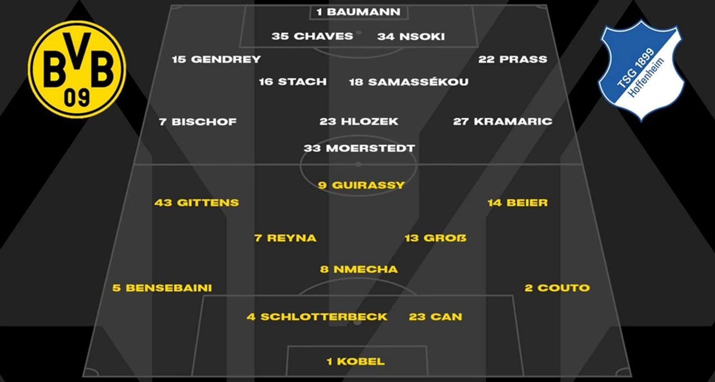 Получивший травму в среду Нико Шлоттербек, несмотря на травму лодыжки, поставил себя на службу команде и, стиснув зубы, вышел в стартовом составе. Для главного тренера черно-желтых Нури Шахина это было очень кстати, поскольку подходящей замены основному защитнику просто не было: Грегор Кобель, Иан Коуту, Эмре Джан, Нико Шлоттербек, Рами Бенсебаини, Джованни Рейна, Феликс Нмеча, Паскаль Гросс, Максимилиан Байер, Джейми Гиттенс и Серу Гирасси. В расстановке 4-3-3 Нмеча играл на месте единственного опорника, а Гросс и Рейна занимали места в центре полузащиты.