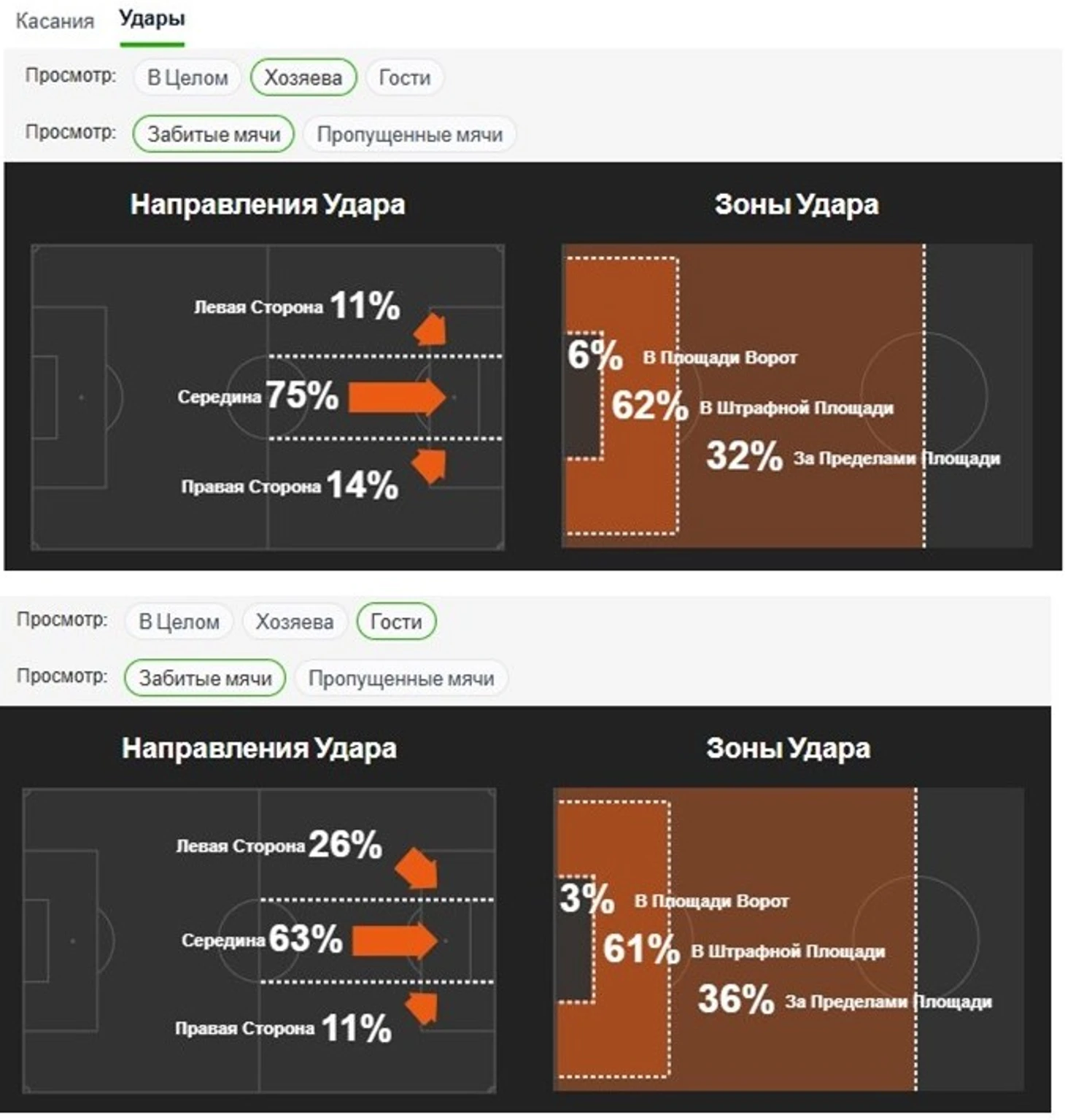 Схемы направлений ударов показывают, что и Альшин и Брахими в домашних матчах проворачивают один и тот же маневр: прорыв по флангу и передача в центр штрафной, откуда приходится 75 % всех попыток ударов. В гостевых матчах структура игры меняется. Центральные полузащитники уже не так активно поддерживают фланги, происходит перекос налево, откуда часто бьют Альшин и Каштанов. Увеличивается процент дальних ударов. Игра становится более однообразной и предсказуемой. Но даже несмотря на более низкий блок, обращает на себя внимание очень большое количество ударов, который допускает Факел из своей вратарской. По всей вероятности, именно для этого в тройку центральных защитников был отправлен более мобильный Калинин, а также возвращен в основу Сенханджи.
