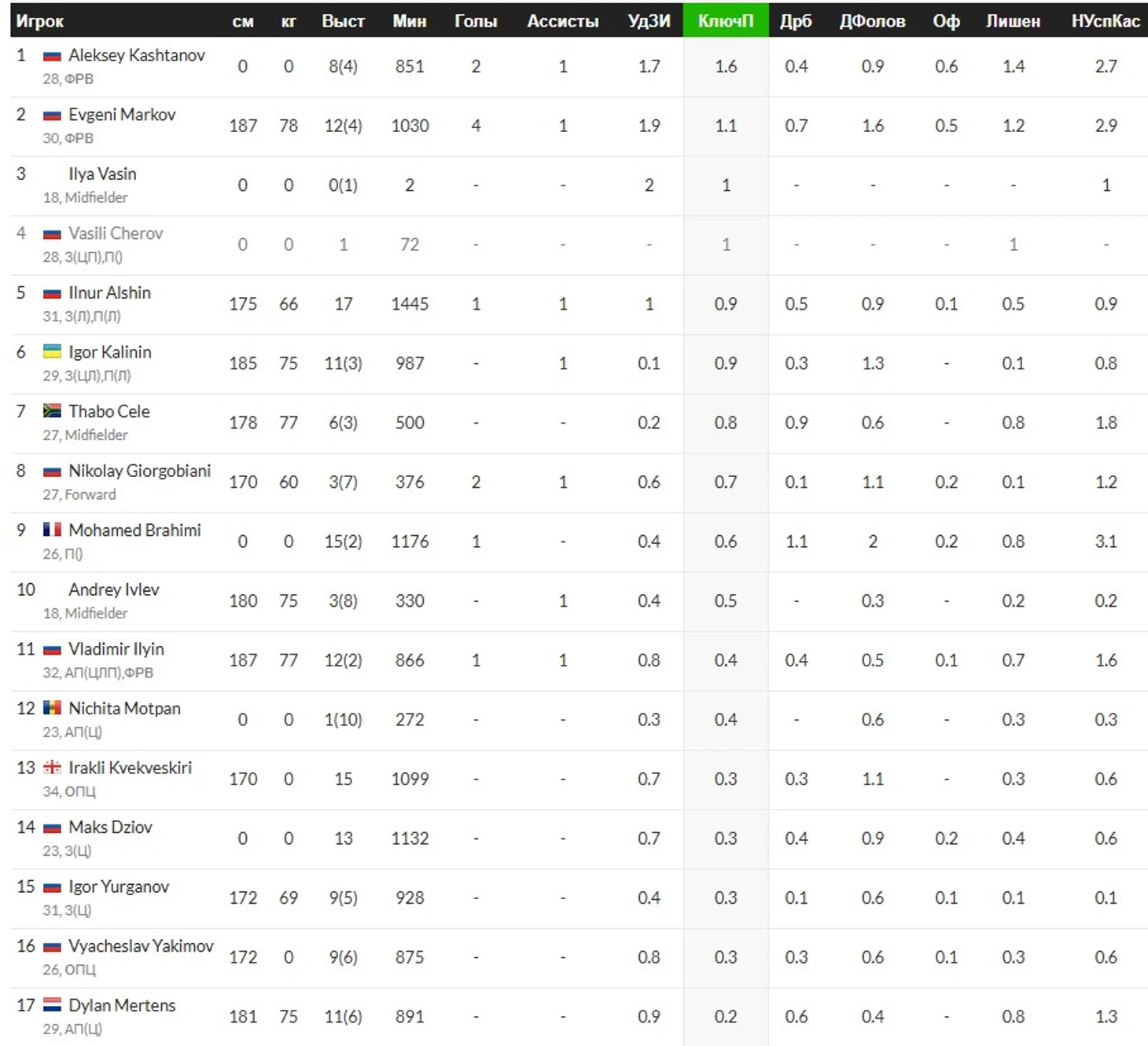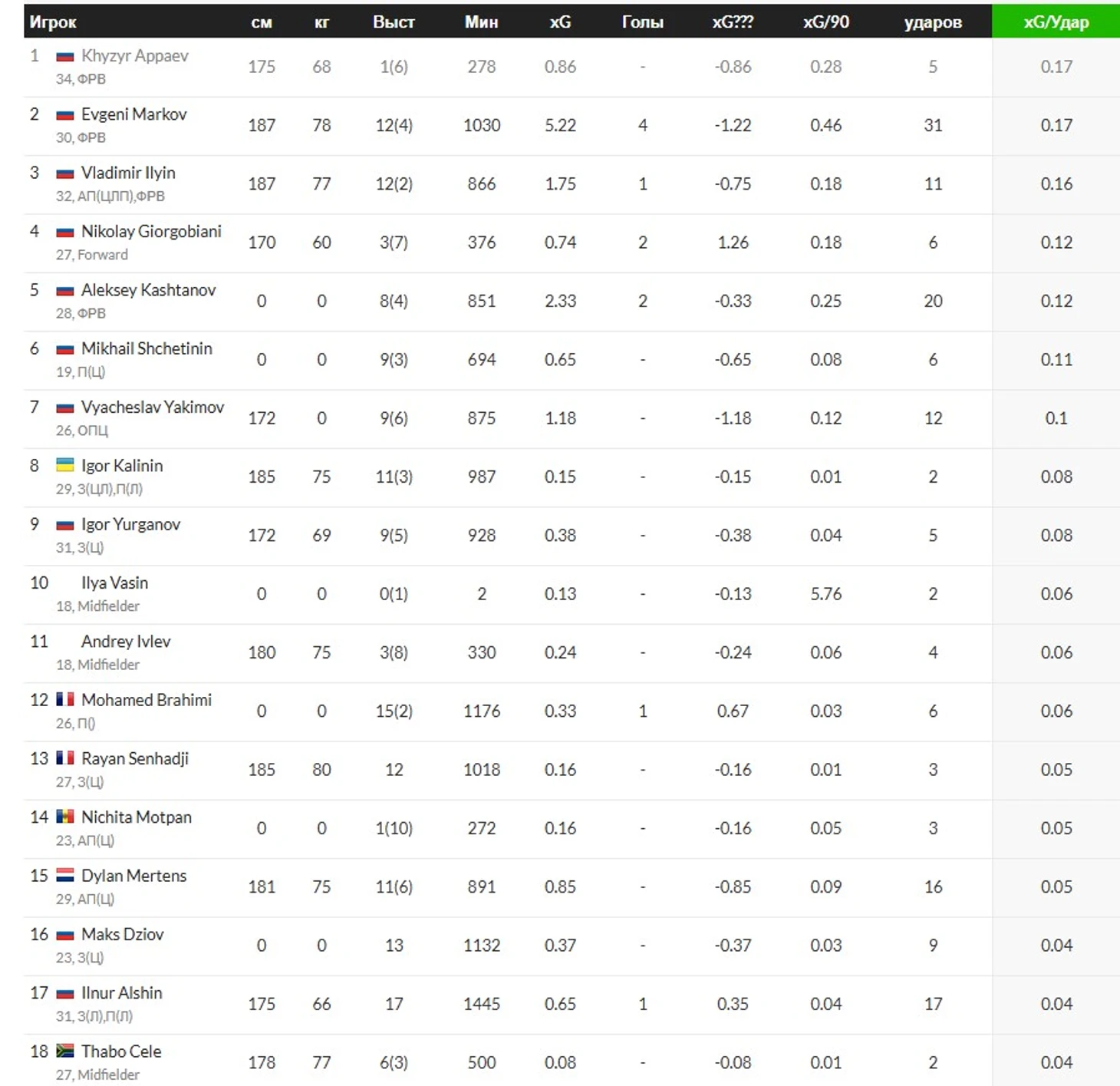 Что касается атаки, то удивительным образом по отношению xG/удар среди нападающих до сих пор лидирует Хызыр Аппаев. Это в очередной раз заставляет задуматься о том, насколько Аппаев мог бы доминировать, будь у него более поставленный удар. Остальные форварды бьют очень много, но все эти удары не являются опасными. Особенно катастрофической выглядит статистика Дилана Мертенса и Ильнура Альшина, большинство ударов которых летят в молоко.