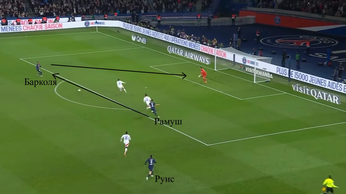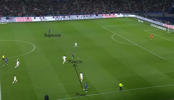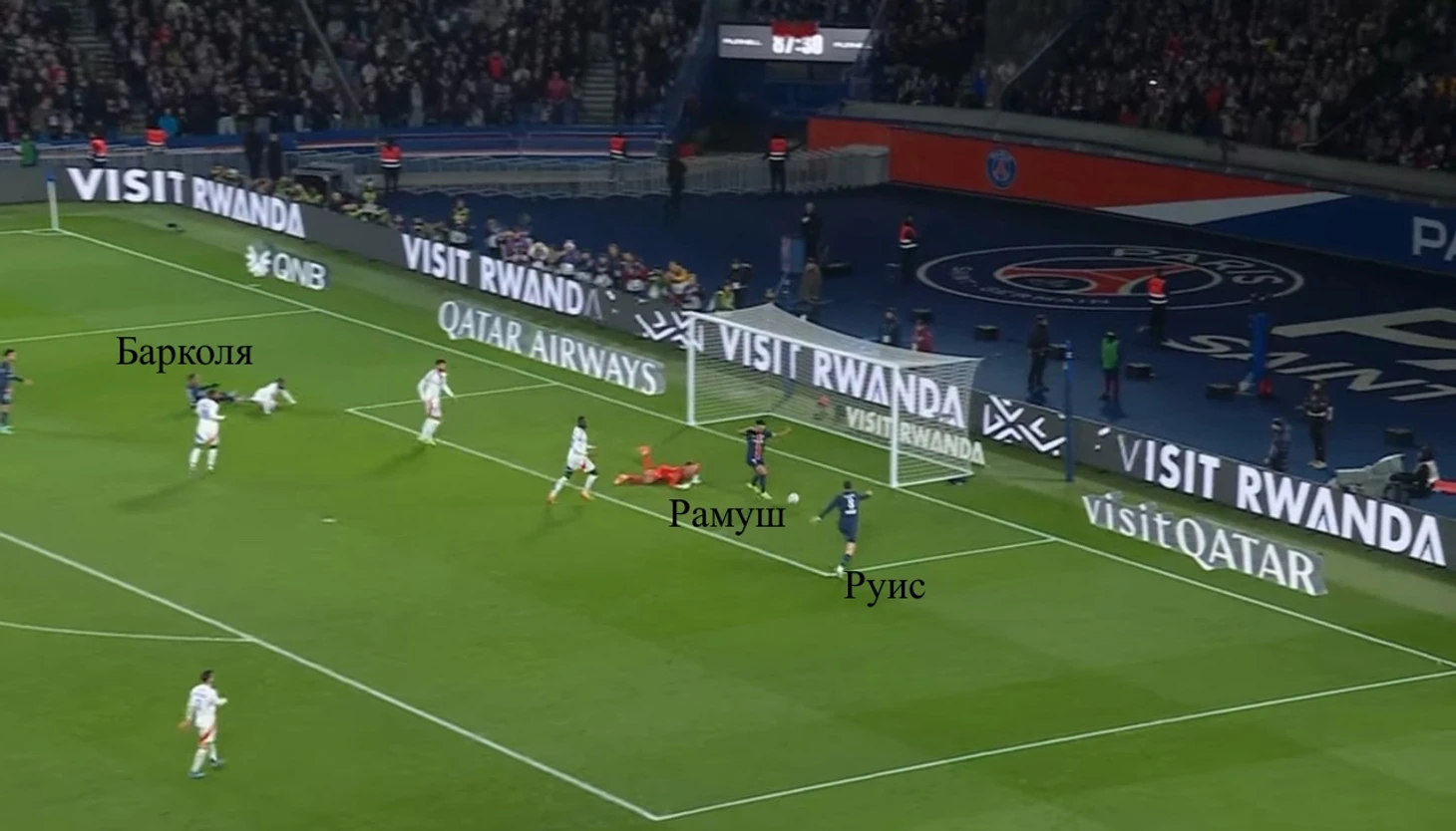 Быструю атаку на 88-ой минуте разыгрывают парижане после вбрасывания мяча из аута. Вышедший на замену вместо Усмана Дембеле на 86-ой минуте Фабиан Руис получает мяч на правом фланге и быстро движется вперед. Руис делает пас на середину, где располагается Гонсалу Рамуш. Образуется атака 3 на 3. От Рамуша следует пас на Барколя. Последний бьет, но попадает во вратаря. На добивании оказывается Рамуш (Рисунок 6-8). 3:1!